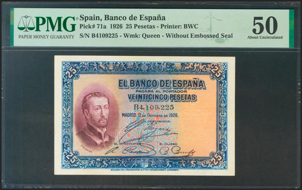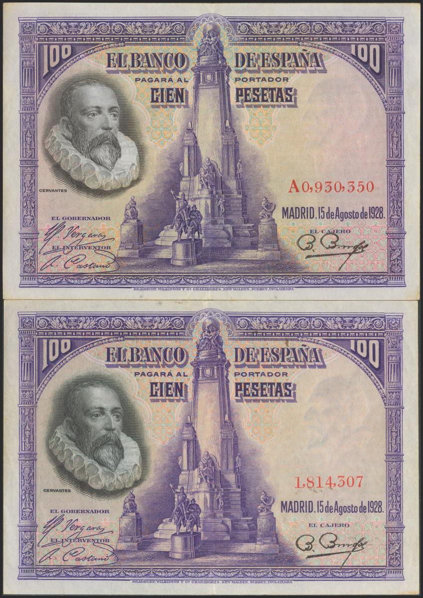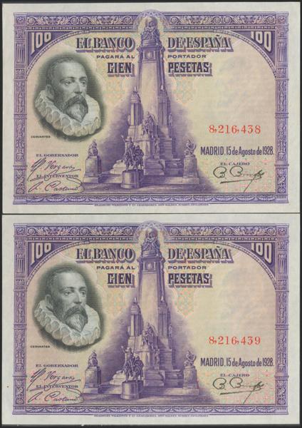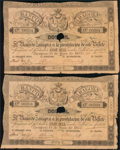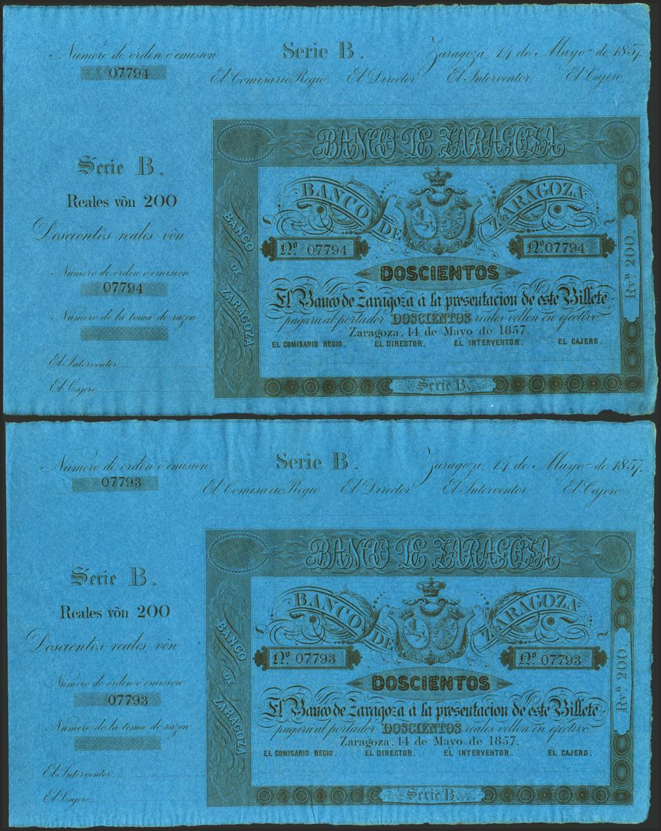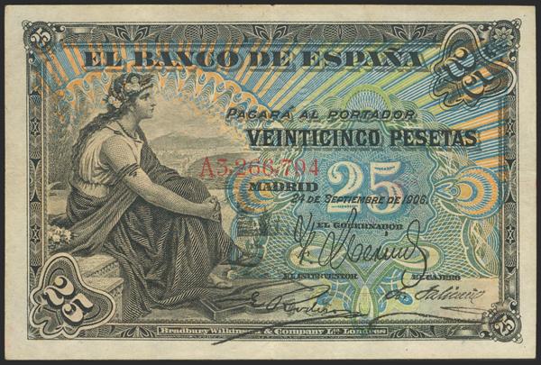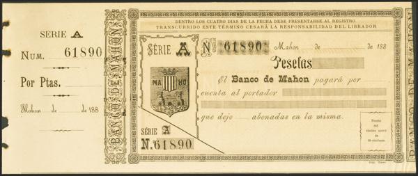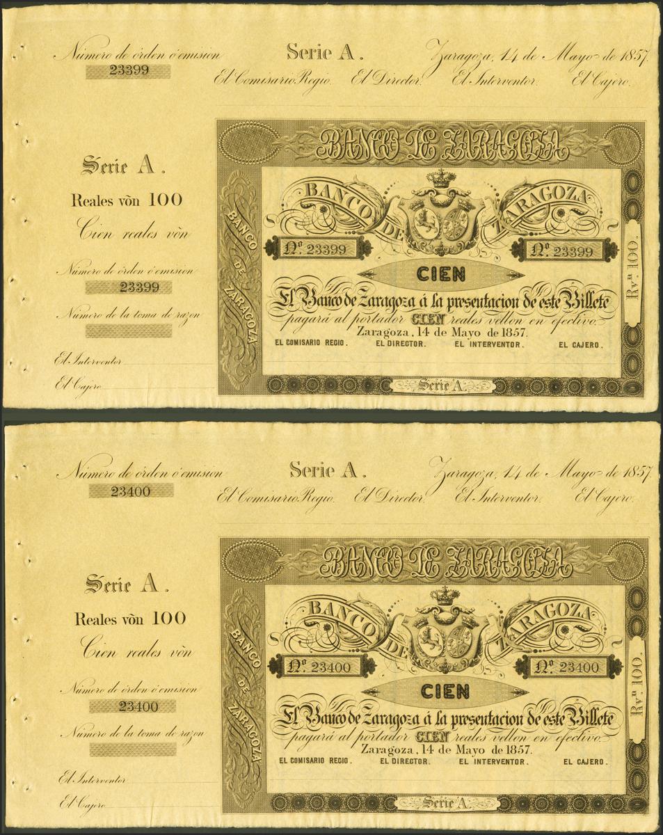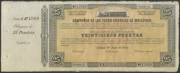 25 Pesetas. 1 de Julio de 1885. Pareja correlativa. Compañía de los Ferrocarriles (Mallorca). Serie A y matriz a la izquierda. Para entender mejor la contextualización de este billete recomendamos la obra "Obligaciones, vales y documentos puestos en circulación como papel moneda en España", de Don Ramón Cobo Huici. SC-