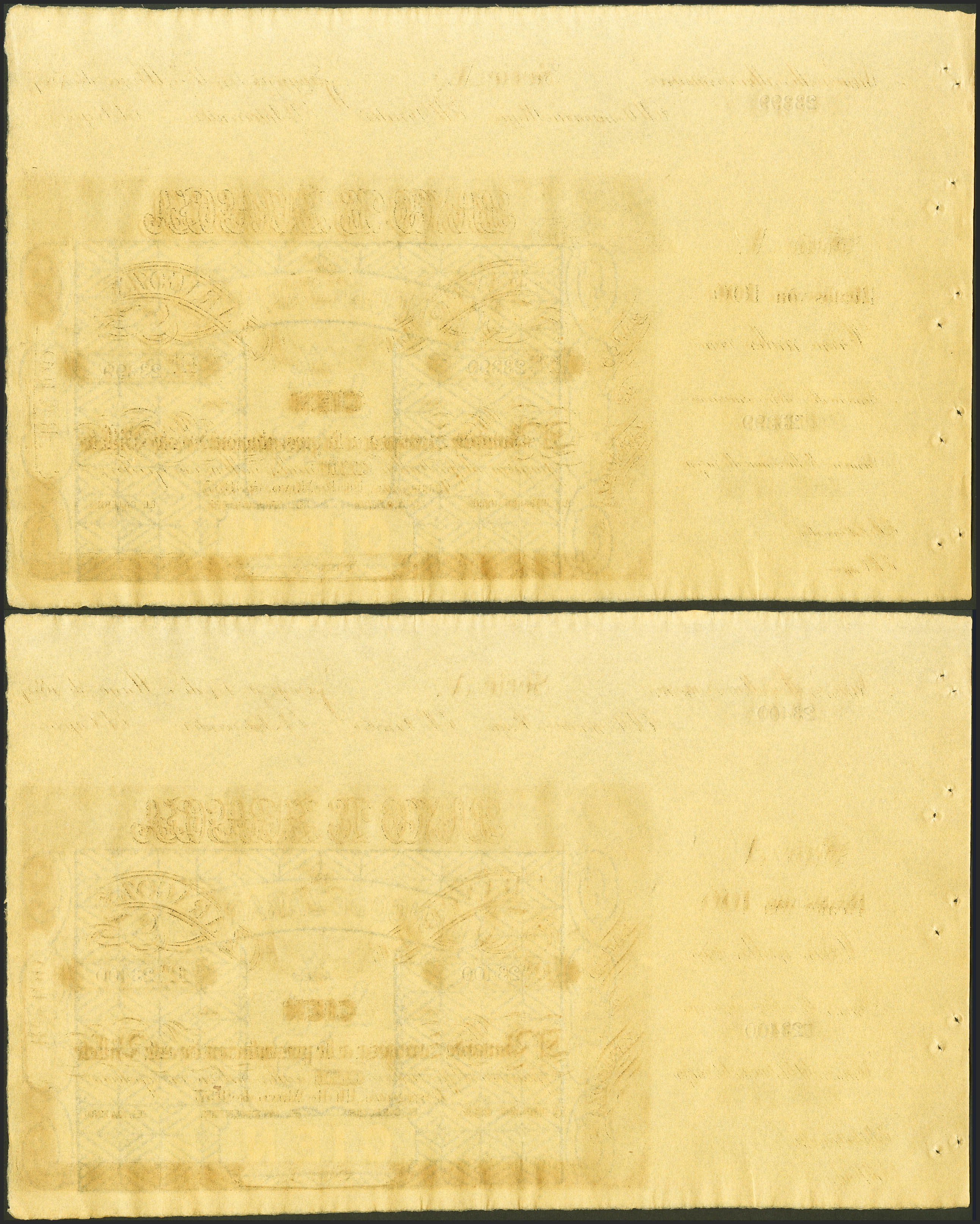 100 Reales. 14 de Mayo de 1857. Pareja correlativa. Banco de Zaragoza. Serie A y con matriz. (Edifil 2021: 126B). Apresto original. SC.