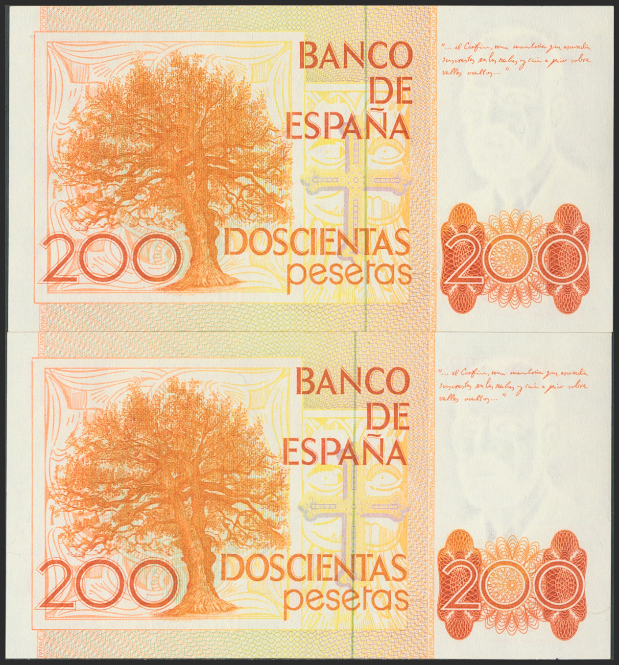 200 Pesetas. 16 de Septiembre de 1980. Pareja correlativa. Sin serie y numeración muy baja. (Edifil 2017: 480). SC.