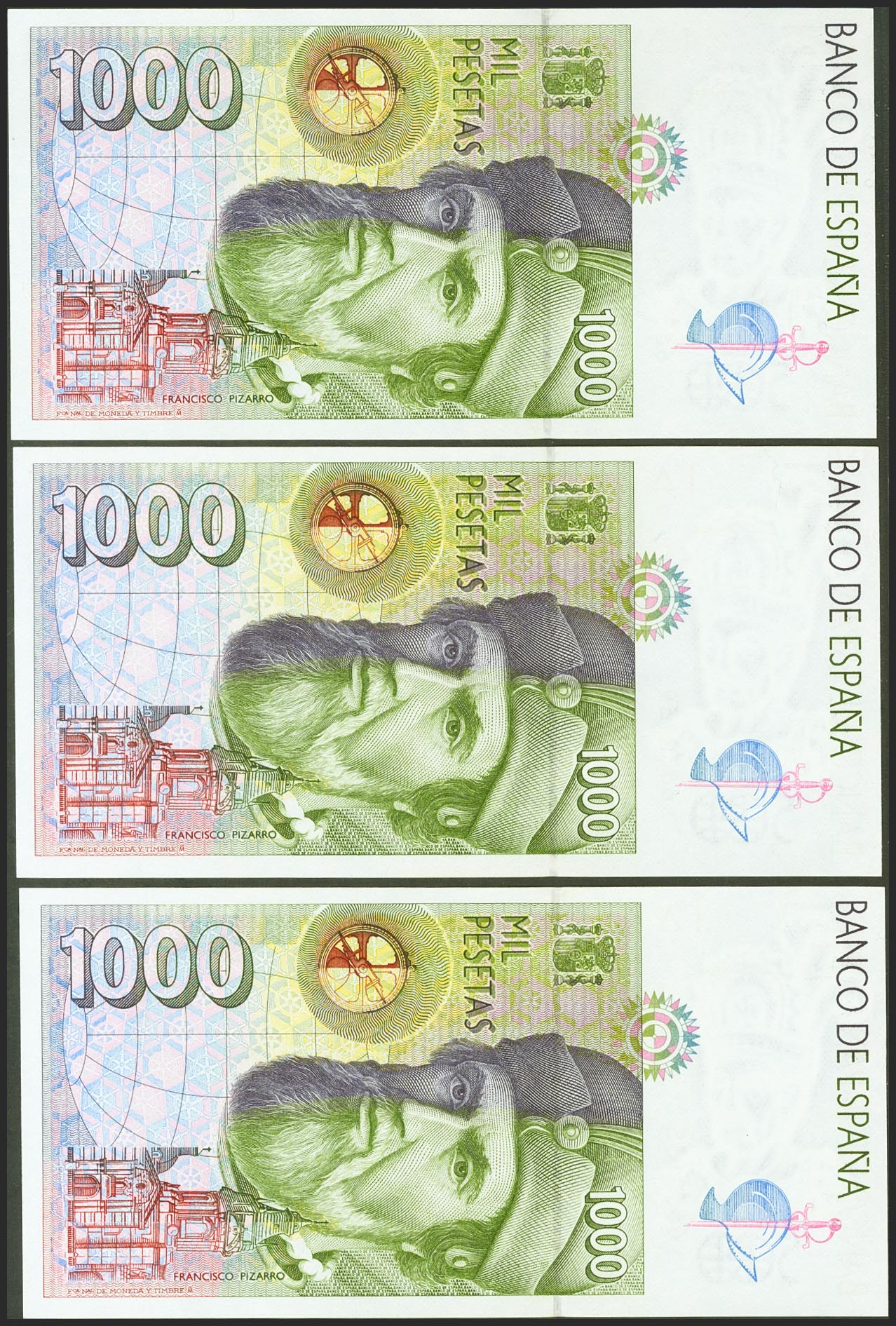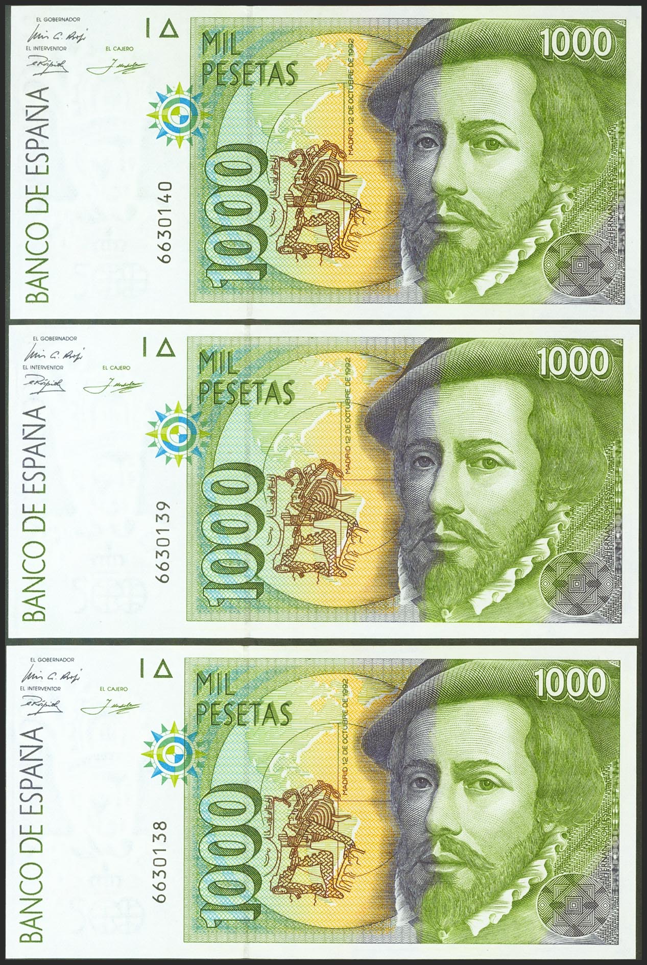 1000 Pesetas. 12 de Octubre de 1992. Trío correlativo. Sin serie. (Edifil 2021: 483). SC.