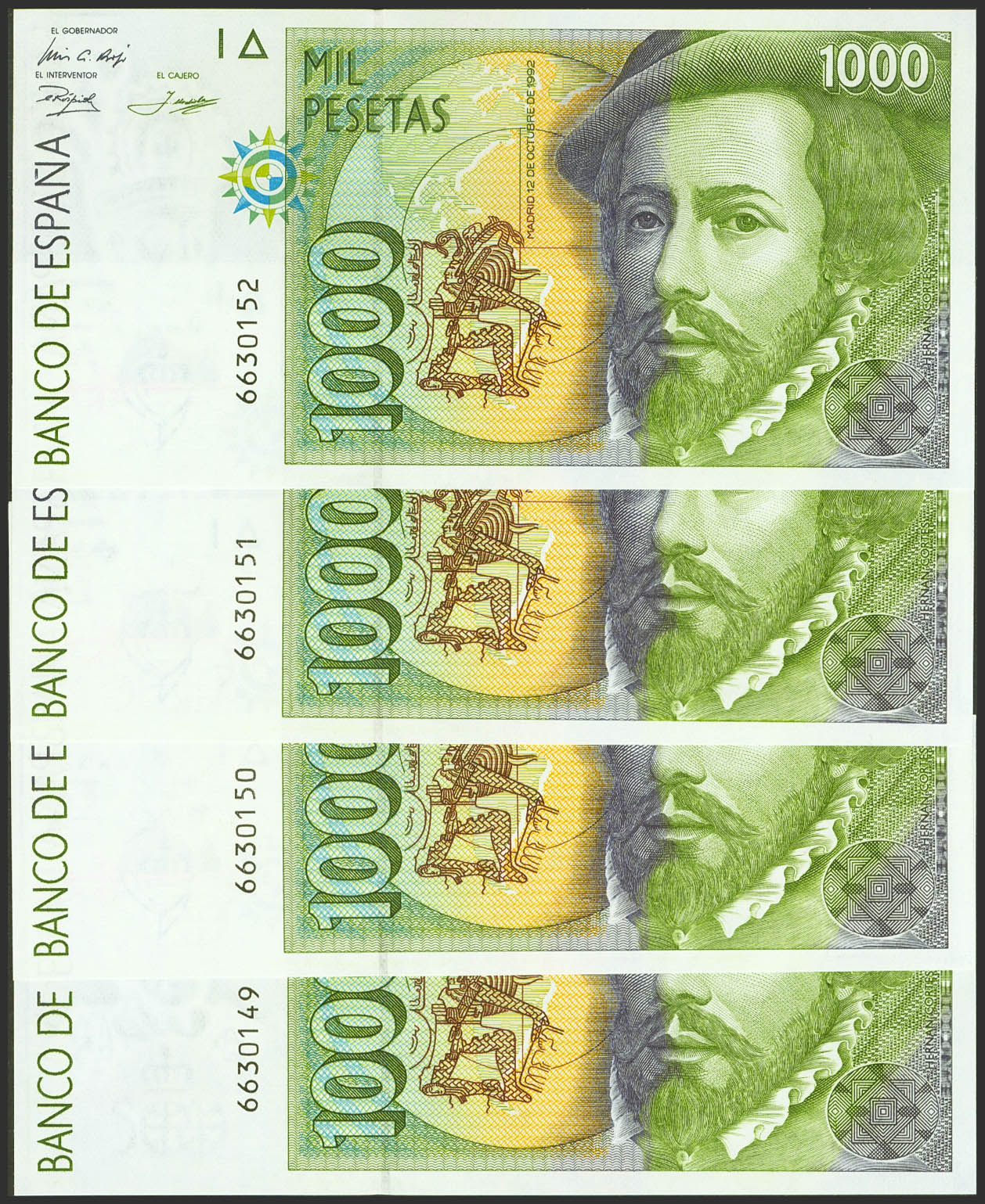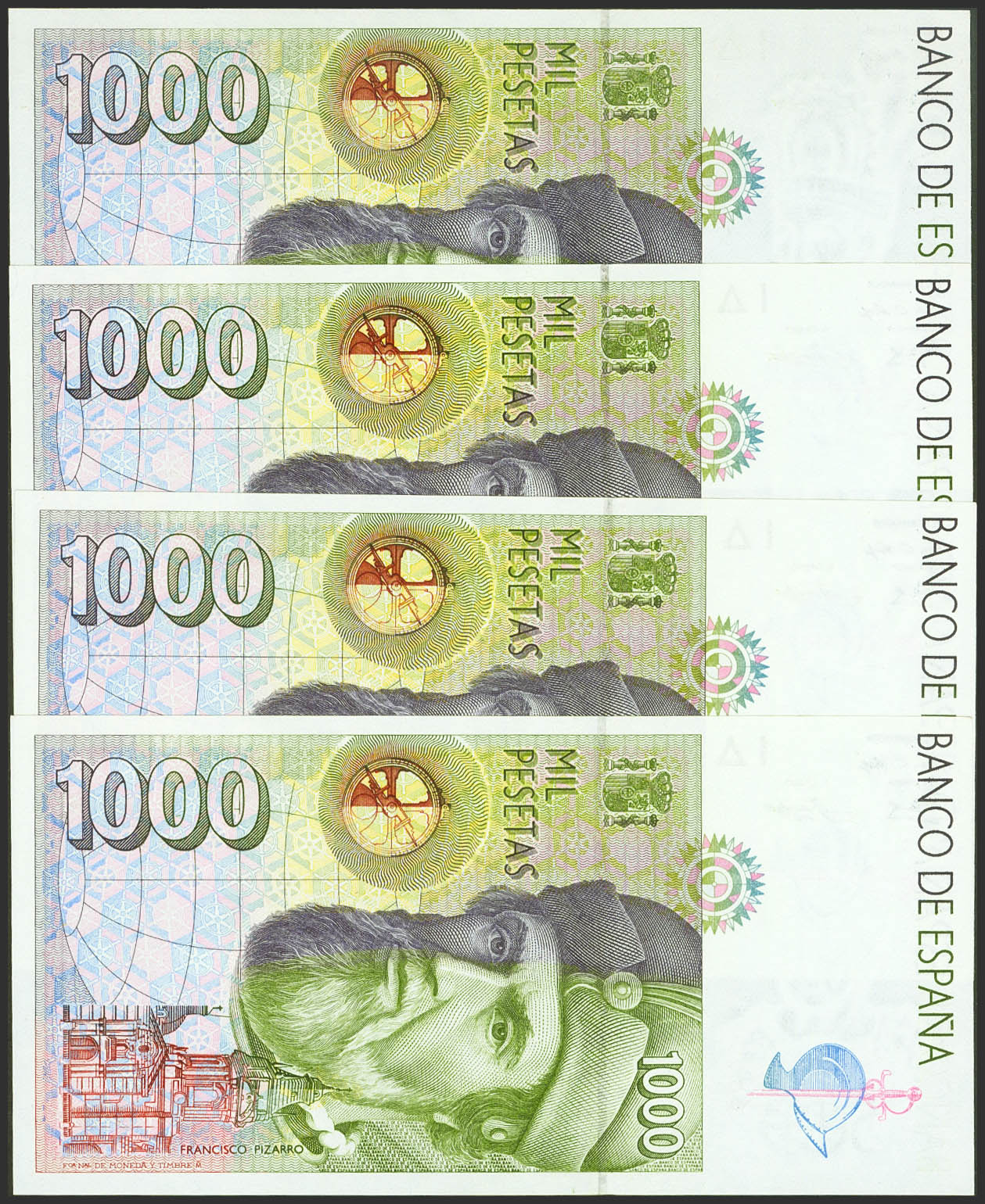 Conjunto de 4 billetes correlativos de 1000 Pesetas, emitidos el 12 de Octubre de 1992, sin serie. (Edifil 2021: 483). SC.