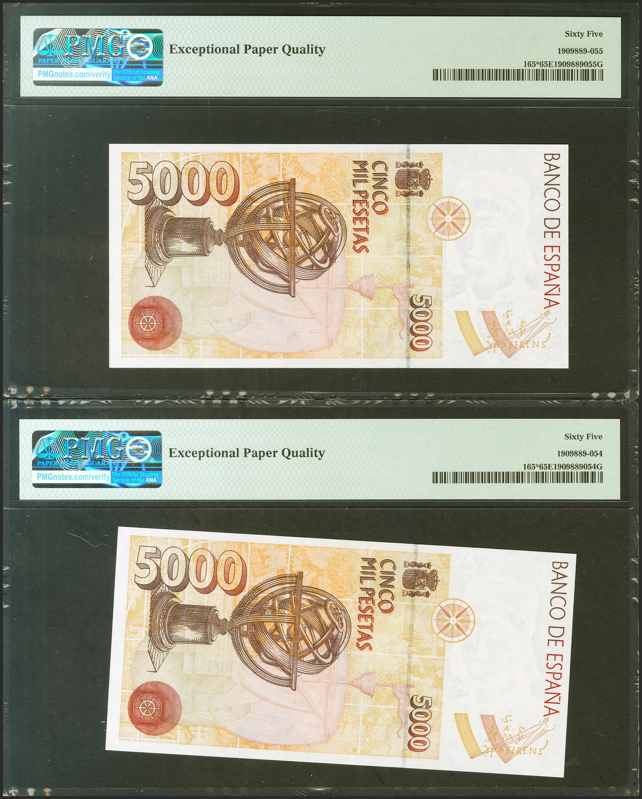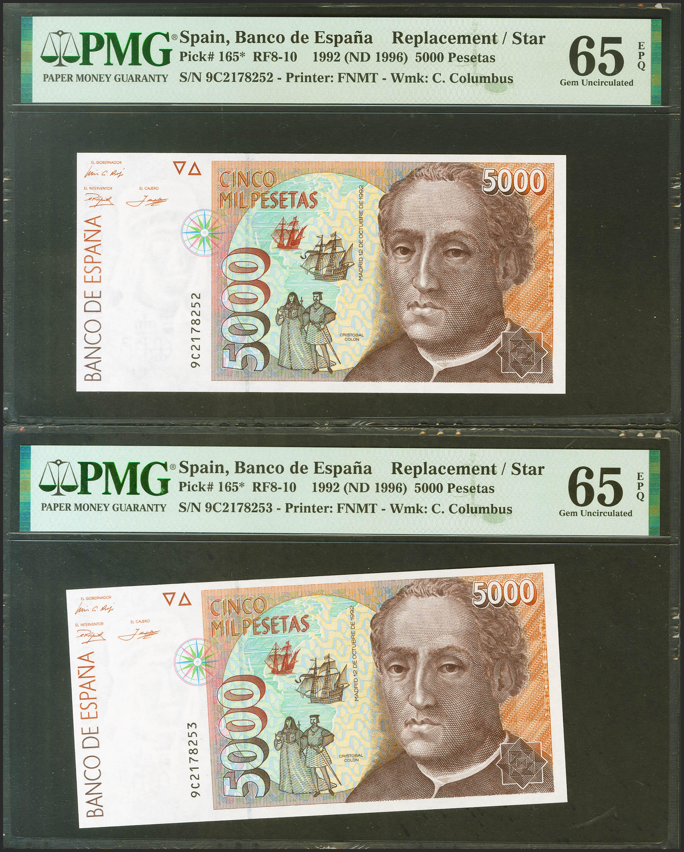 5000 Pesetas. 12 de Octubre de 1992. Pareja correlativa. Serie especial 9C. (Edifil 2021: 484b, Pick: 165*). Rara en esta calidad, apresto original. SC. Encapsulado PMG65EPQ, ambos.