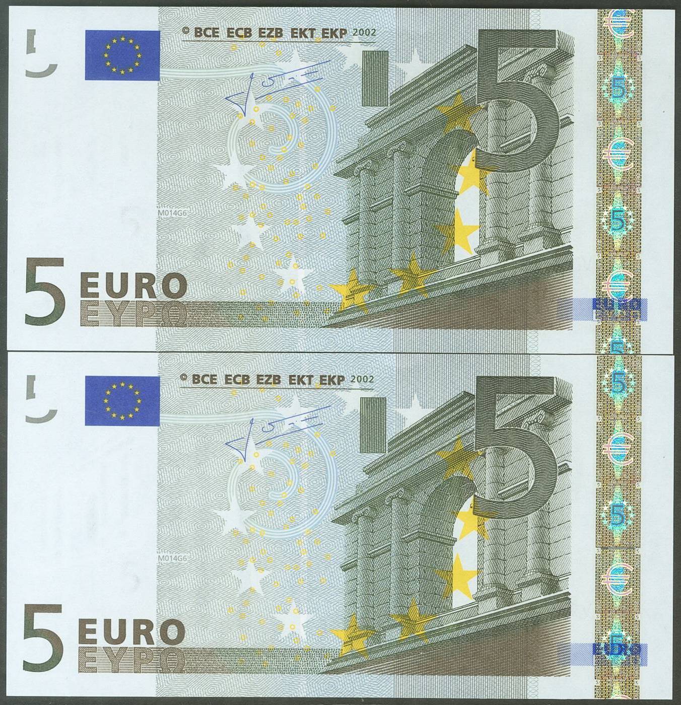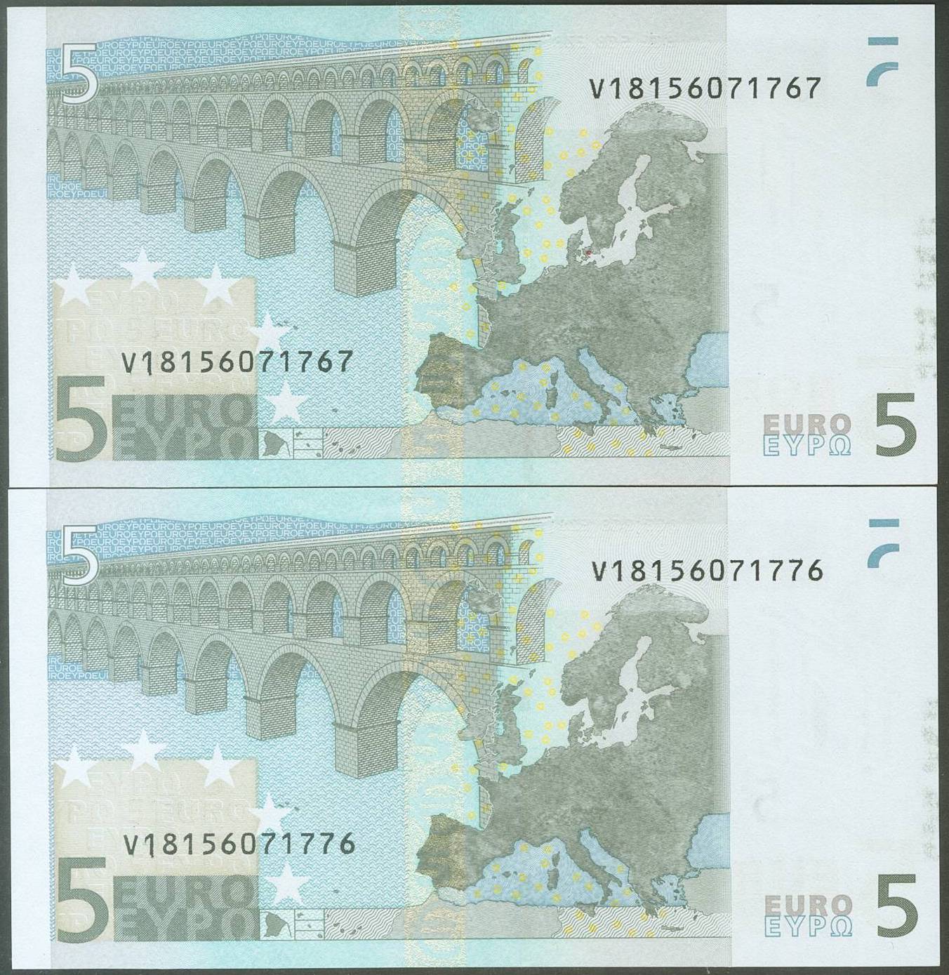 5 Euros. 1 de Enero de 2002. Pareja correlativa. Firma Trichet. Serie V (España) (cabe recordar que el último dígito de la numeración de todos los billetes denominados en euros es para control interno del Banco Central Europeo, el que marca la correlatividad de los billetes es el penúltimo dígito). (Edifil 2021: 486A). SC.