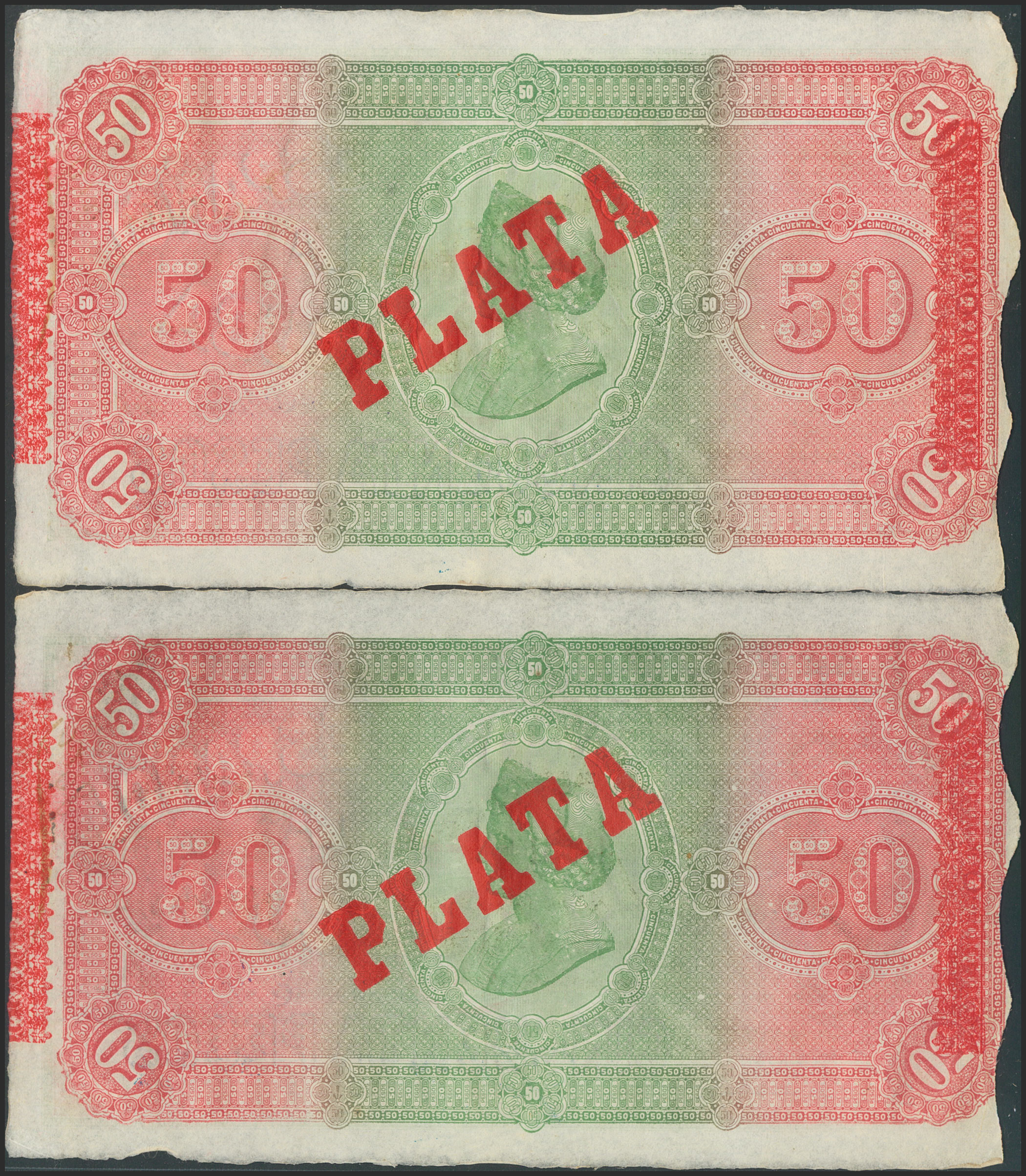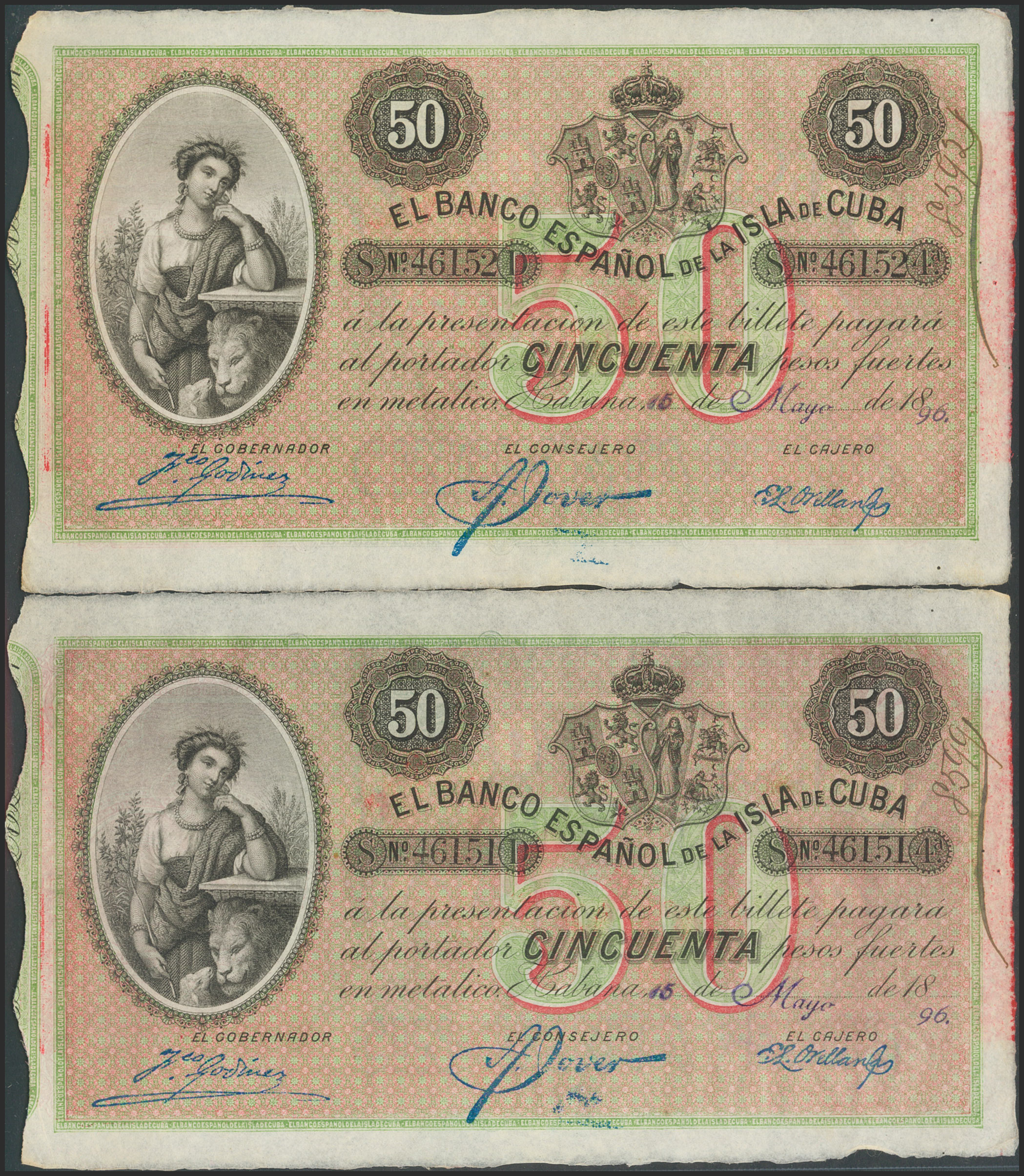 CUBA. 50 Pesos. 15 de Mayo de 1896. Pareja correlativa. Sobrecarga PLATA. (Edifil 2017: 83). EBC+.