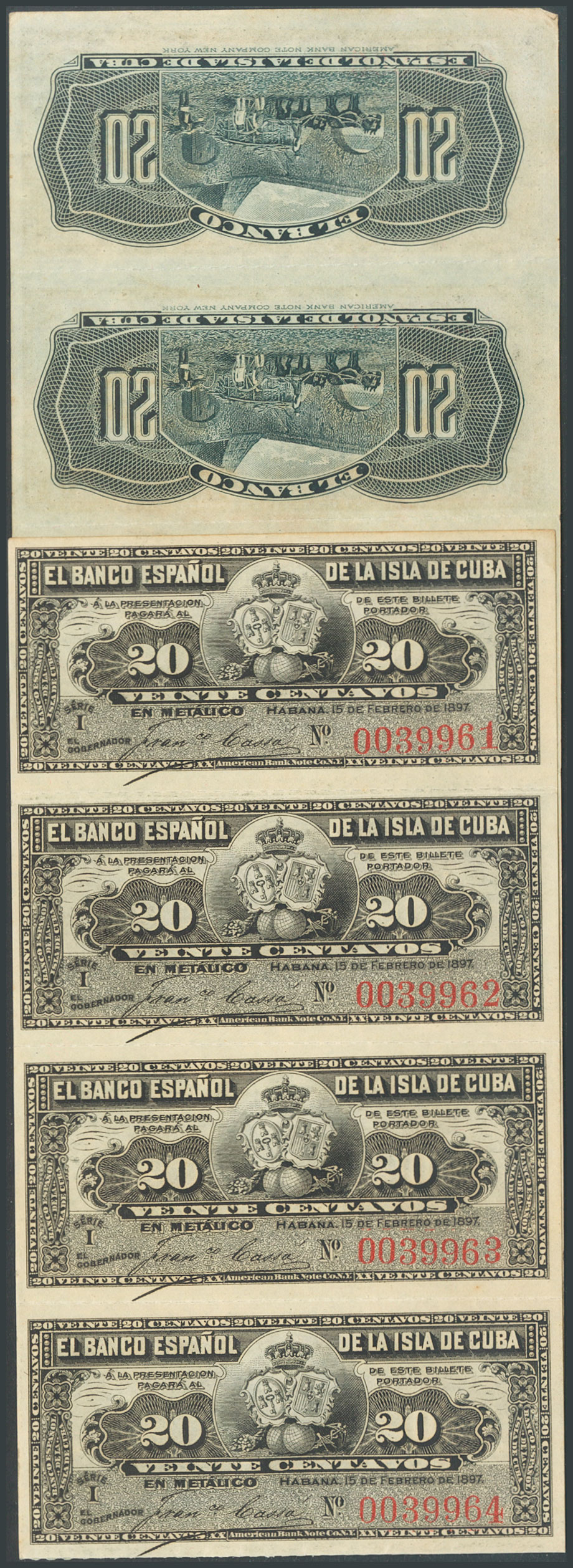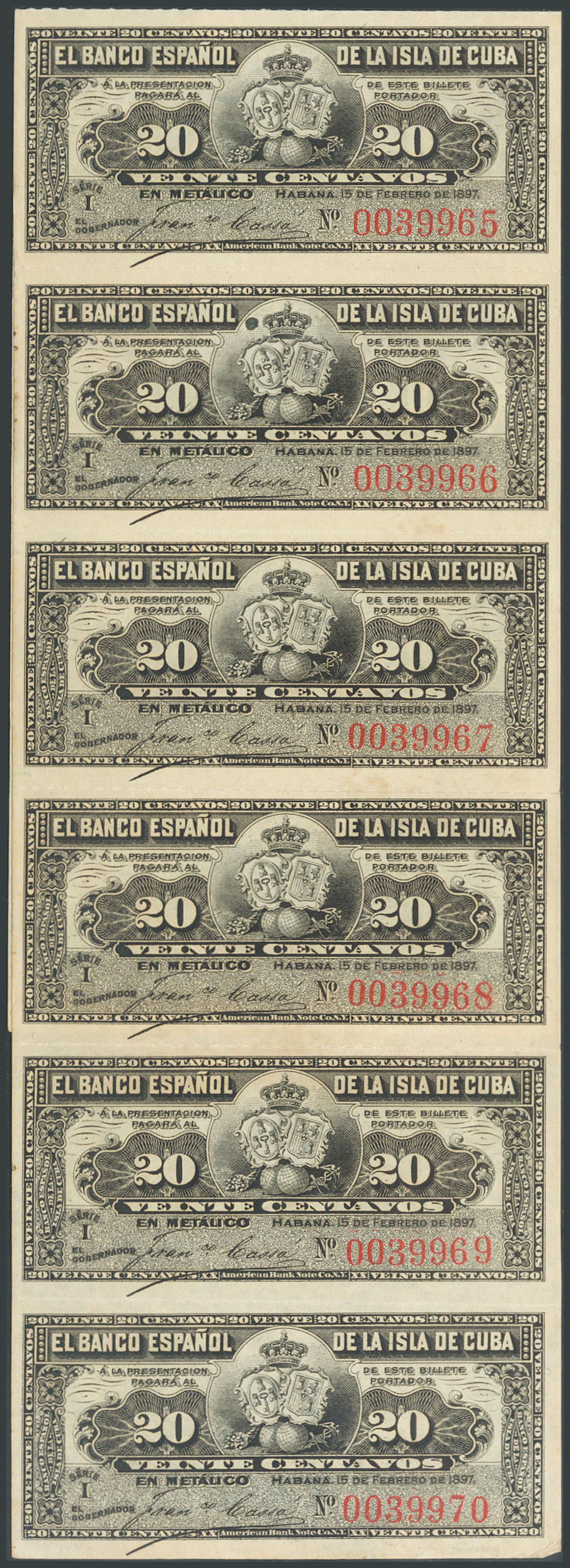 CUBA. 20 Centavos. 15 de Febrero de 1897. Serie I. (Edifil 2017: 85). Pliego completo de 10 billetes. Inusual. SC/SC-.