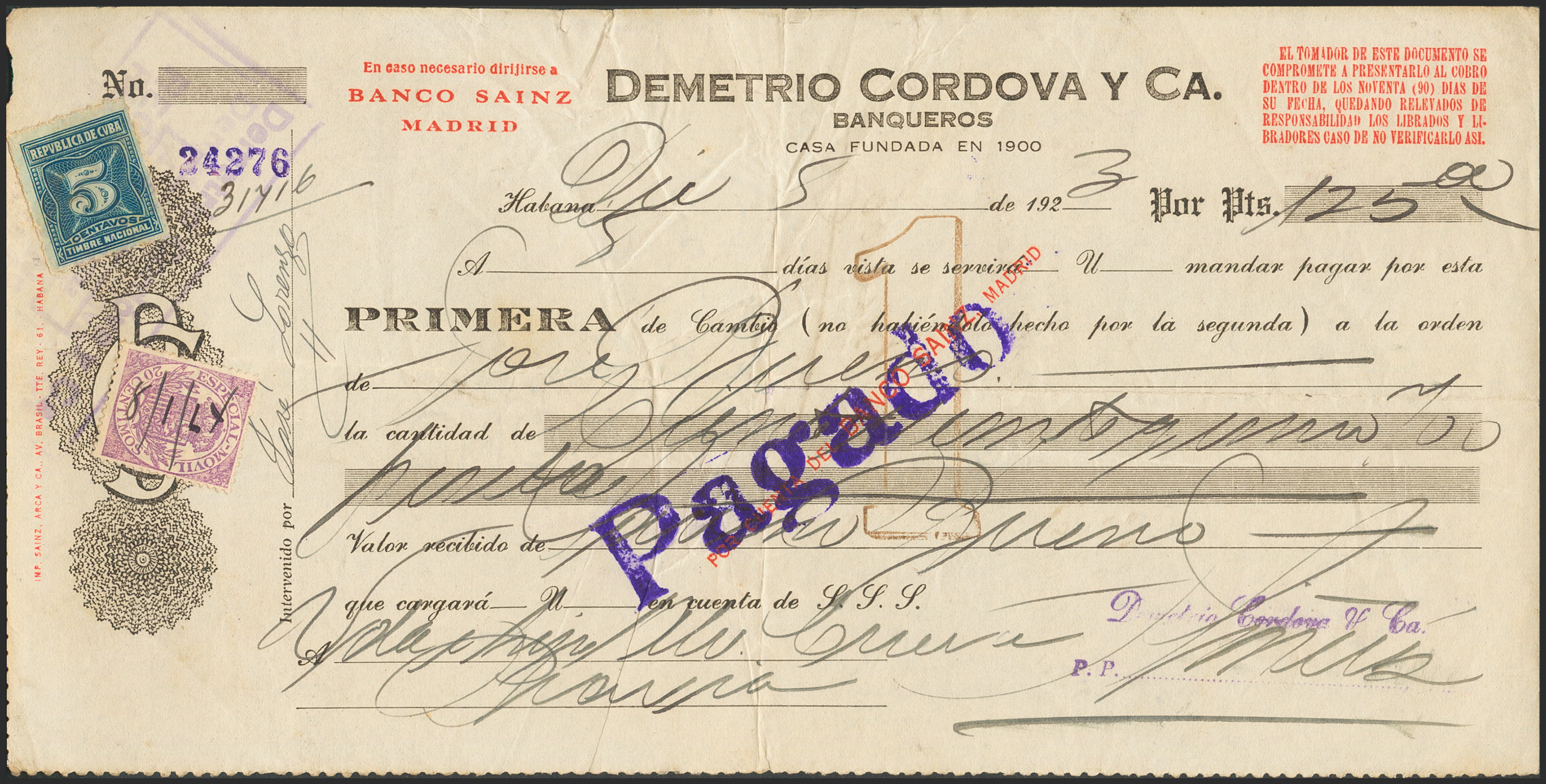 CUBA. Conjunto de 4 cheques y una Letra de Cambio, emitidos y abonados en bancos españoles en La Habana, con las correspondientes tasas fiscales de Cuba y España. Inusual.