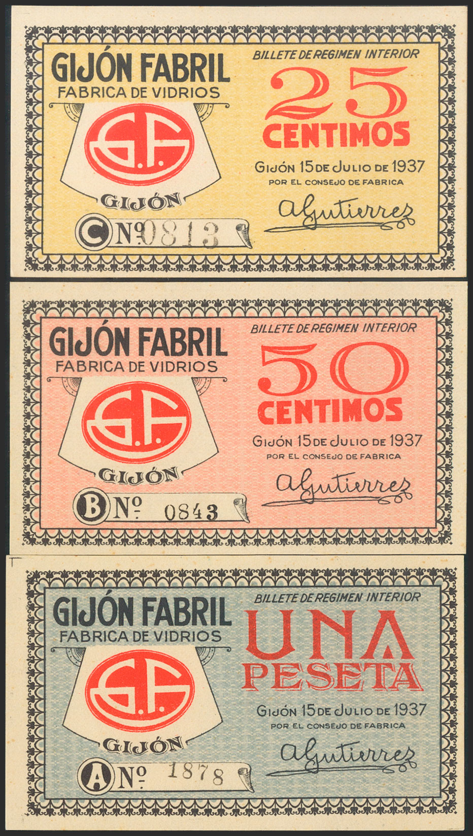 GIJON (ASTURIAS). 25 Céntimos, 50 Céntimos y 1 Peseta. 15 de Julio de 1937. Series C, B y A, respectivamente. (González: 2659/61). Rara serie completa, especialmente en esta excepcional conservación. SC.