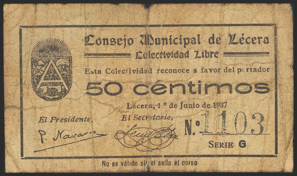 LECERA (ZARAGOZA). 50 Céntimos. 1 de Junio de 1937. Serie G. (González: 3124). Inusual. MBC-.