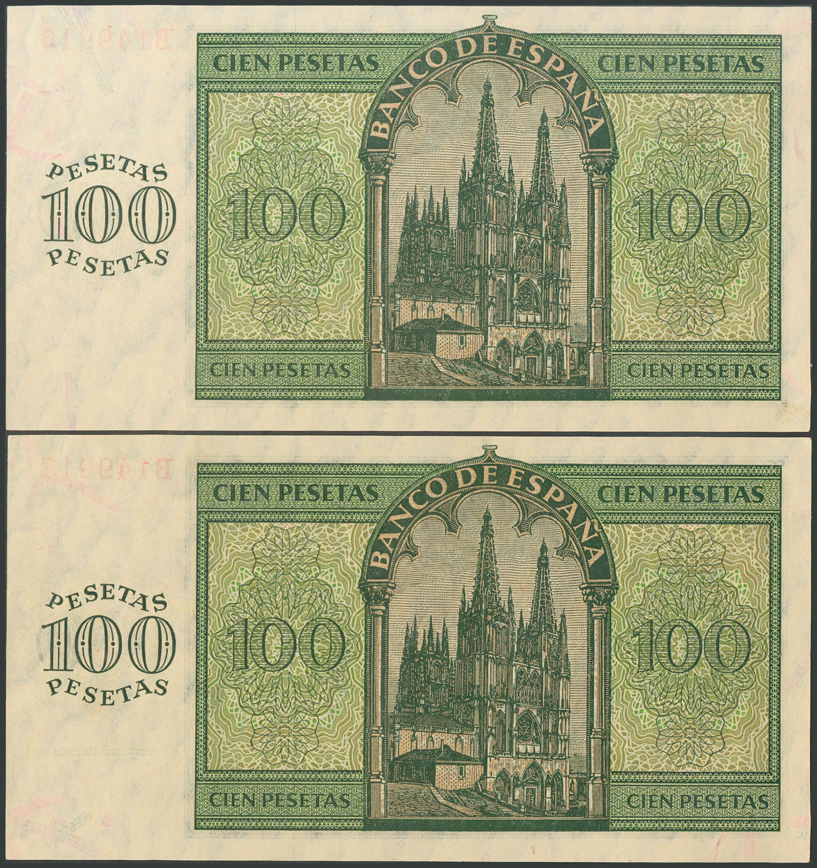 100 Pesetas. 21 de Noviembre de 1936. Pareja correlativa. Serie B. (Edifil 2017: 421a). Conserva su apresto original. EBC+.
