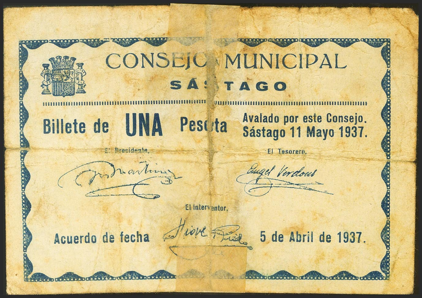 SASTAGO (ZARAGOZA). 1 Peseta. 5 de Abril de 1937. Serie C. (González: 4797). Unido mendiante fijasellos. RC.