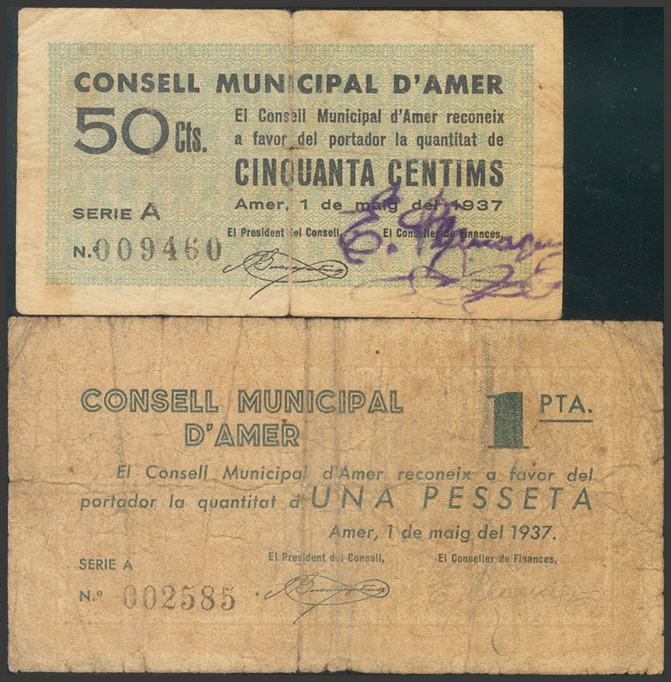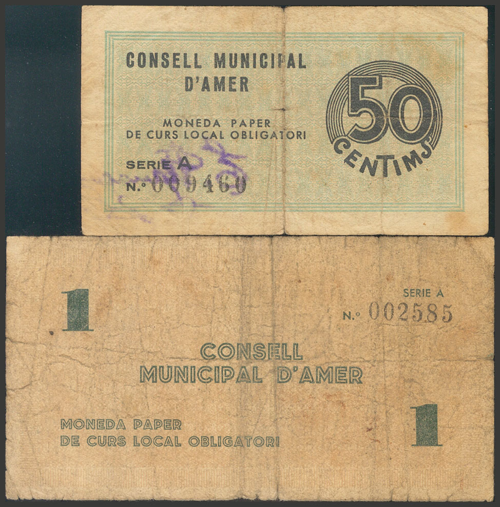 AMER (GERONA). 50 Céntimos y 1 Peseta. 1 de Mayo de 1937. Serie A, ambos. (González: 6246/47). Inusual serie completa. RC+.