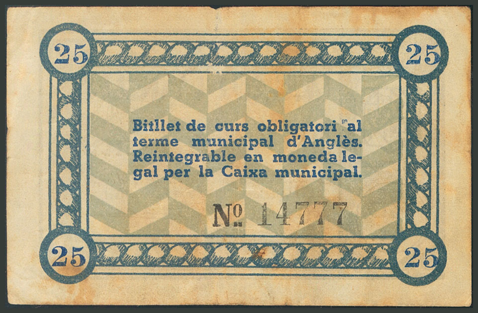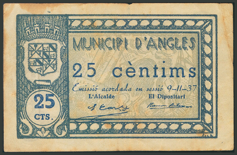 ANGLES (GERONA). 25 Céntimos. 9 de Noviembre de 1937. (González: 6294). MBC-.