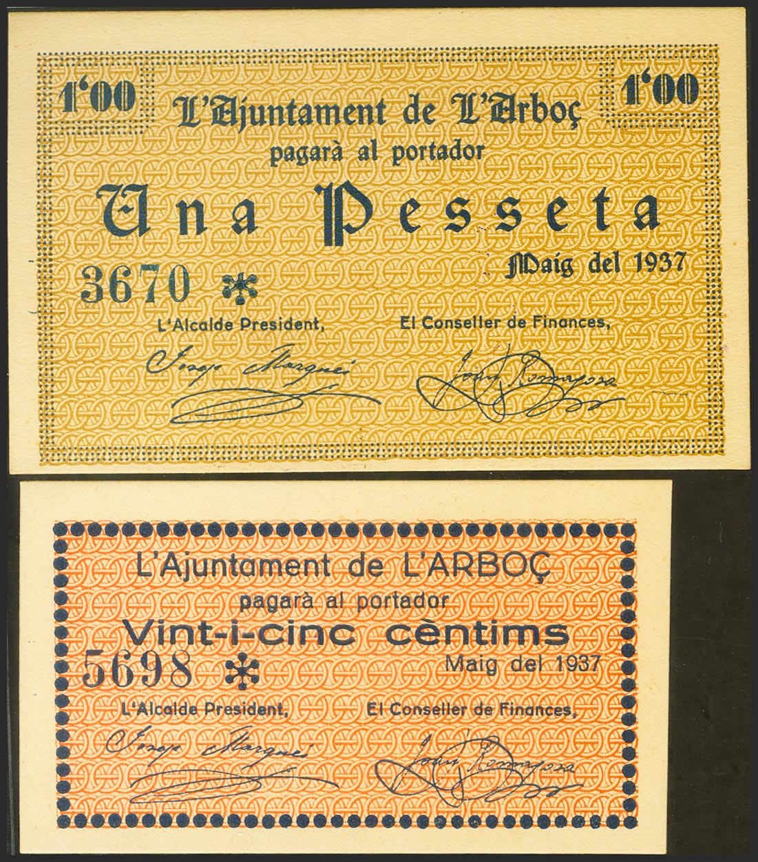 L´ARBOC (TARRAGONA). 25 Céntimos y 1 Peseta. Mayo 1937. (González: 6314, 6316). EBC.