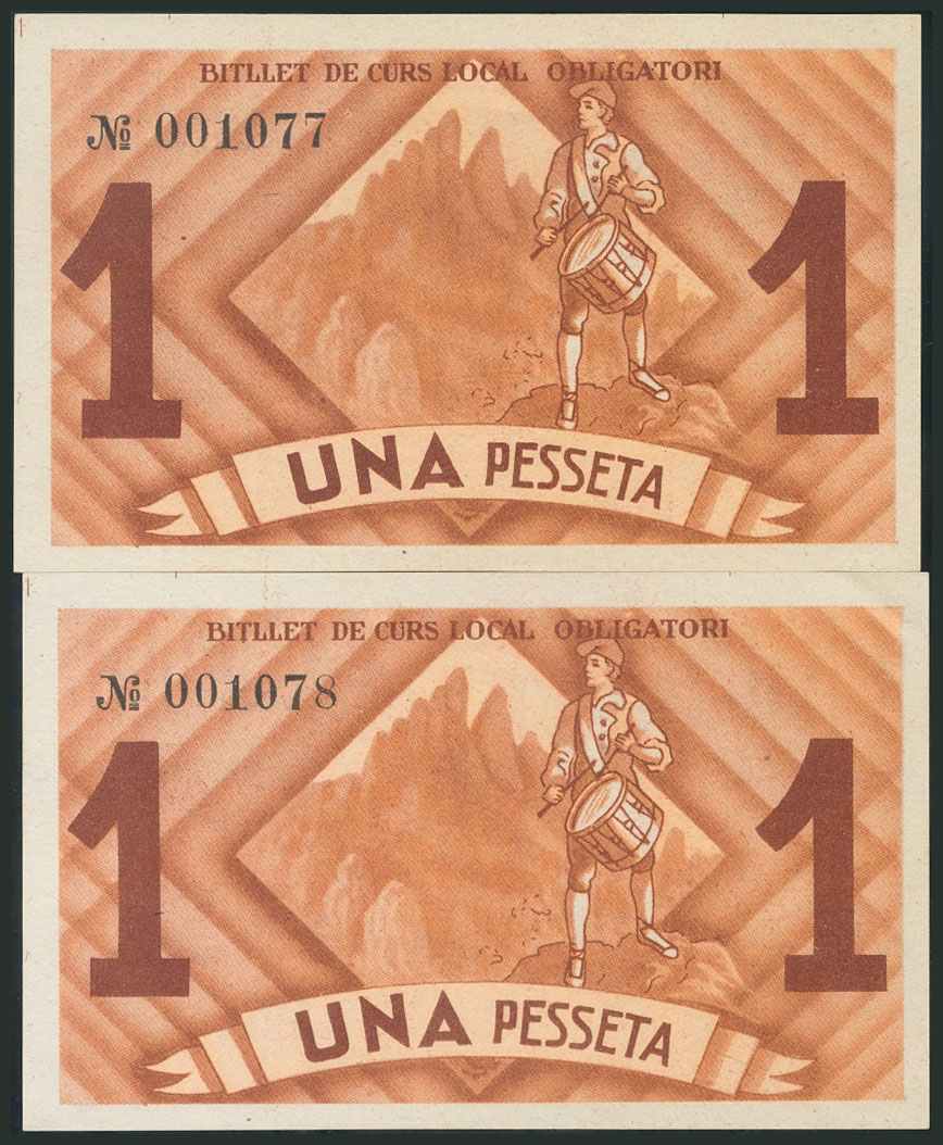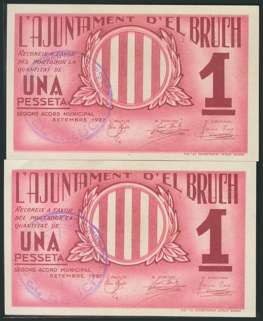 EL BRUCH (BARCELONA). 1 Peseta. Septiembre 1937. Pareja correlativa. (González: 7208). EBC+.