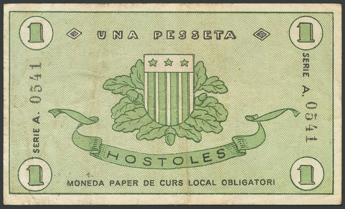 HOSTOLES (GERONA). 1 Peseta. 1 de Mayo de 1937. Serie A. (González: 8235). Inusual. MBC.