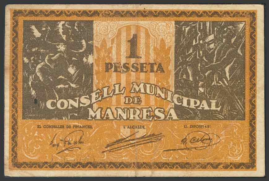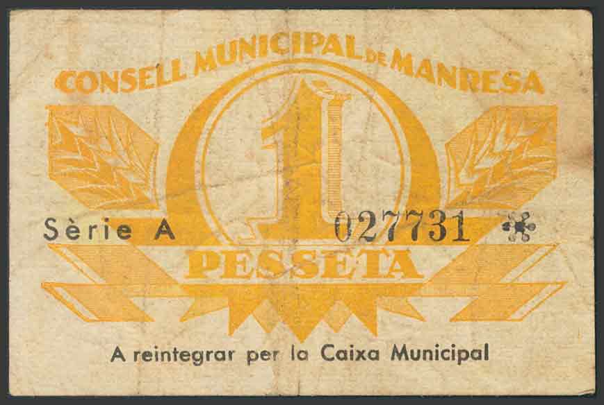 MANRESA (BARCELONA). 1 Peseta. (1937ca). Serie A. (González: 8495). RC.