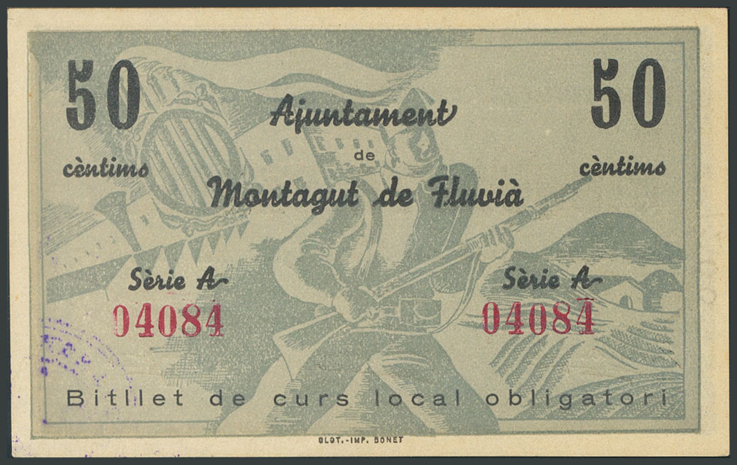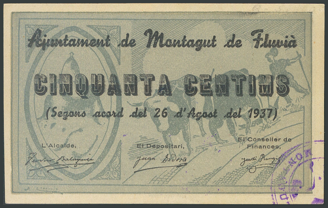 MONTAGUT DE FLUVIA (GERONA). 50 Céntimos. 26 de Agosto de 1937. Serie A. (González: 8739). Inusual. EBC+.