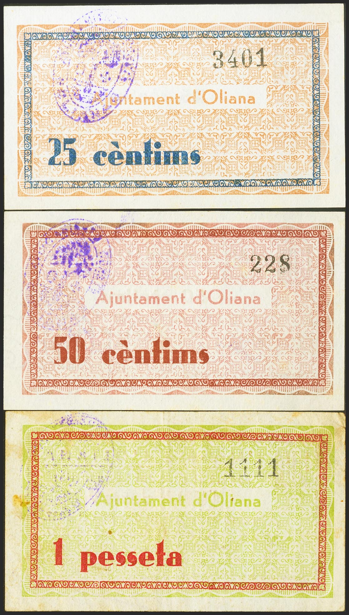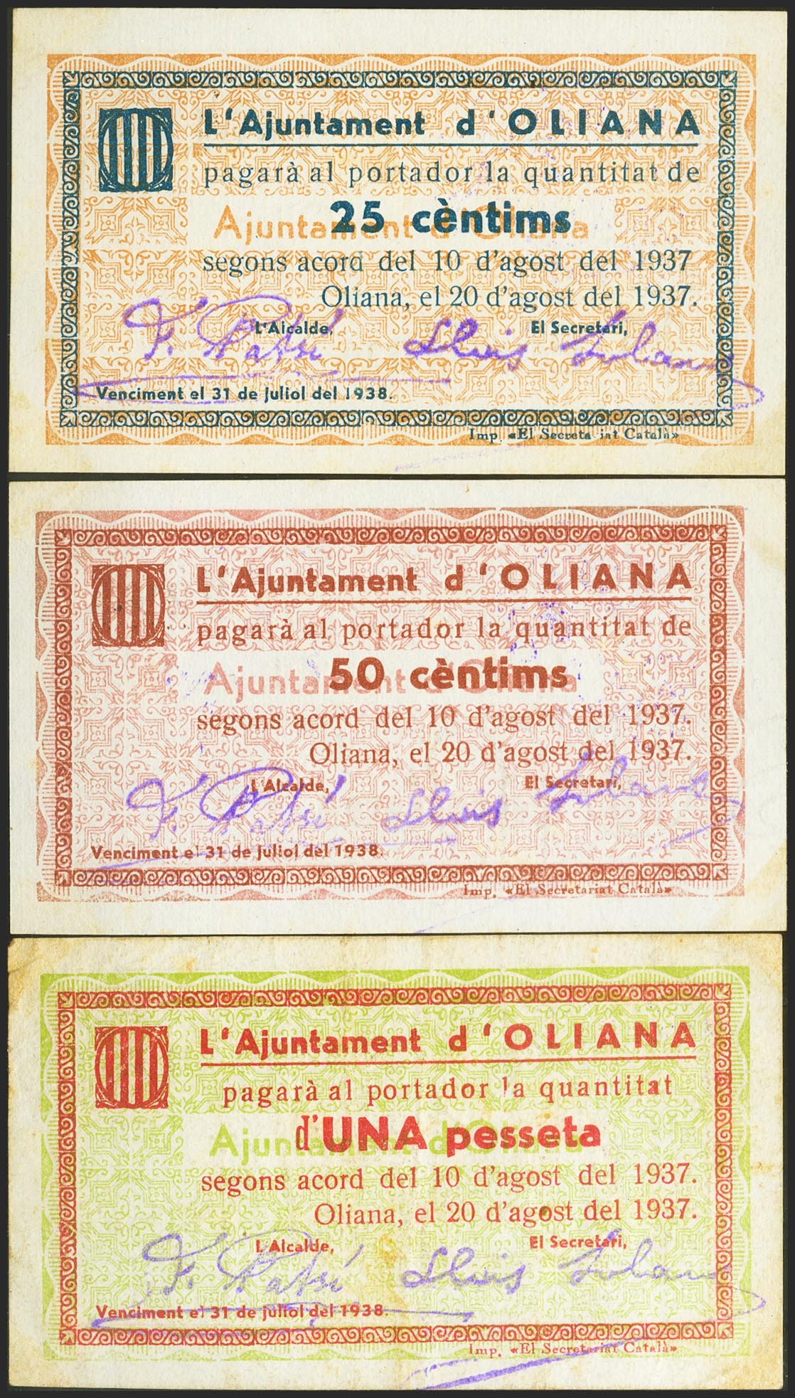 OLIANA (LERIDA). 25 Céntimos, 50 Céntimos y 1 Peseta. 20 de Agosto de 1937. (González: 8942/44). Inusual serie completa. MBC+/EBC.
