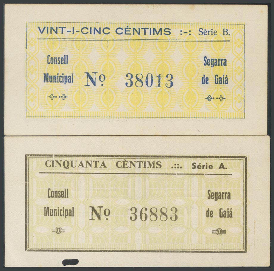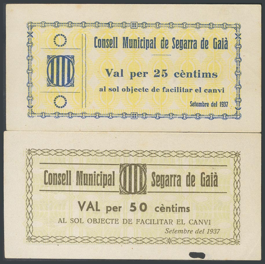 SEGARRA DE GAIA (TARRAGONA). 25 Céntimos y 50 Céntimos (pequeña erosión de polilla). Septiembre 1937. (González: 9911/12). EBC.