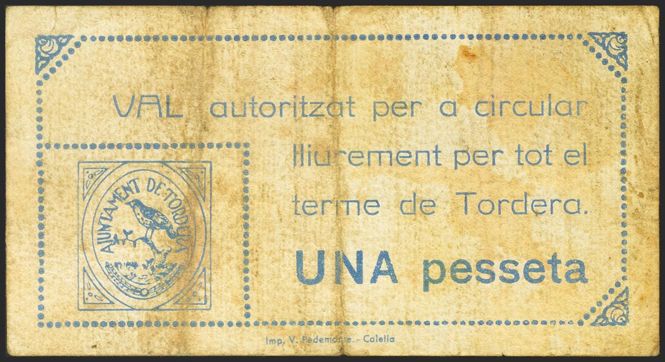 TORDERA (BARCELONA). 1 Peseta. 11 de Mayo de 1937. Serie A. (González: 10304). Inusual. MBC.