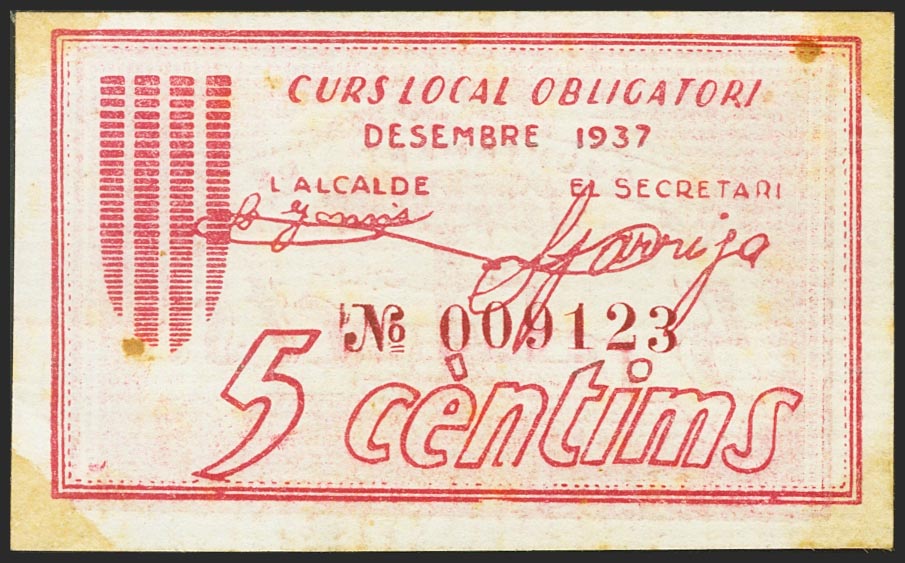 VILASSAR DE DALT (GERONA). 5 Céntimos. Diciembre 1937. (González: 10857). EBC.