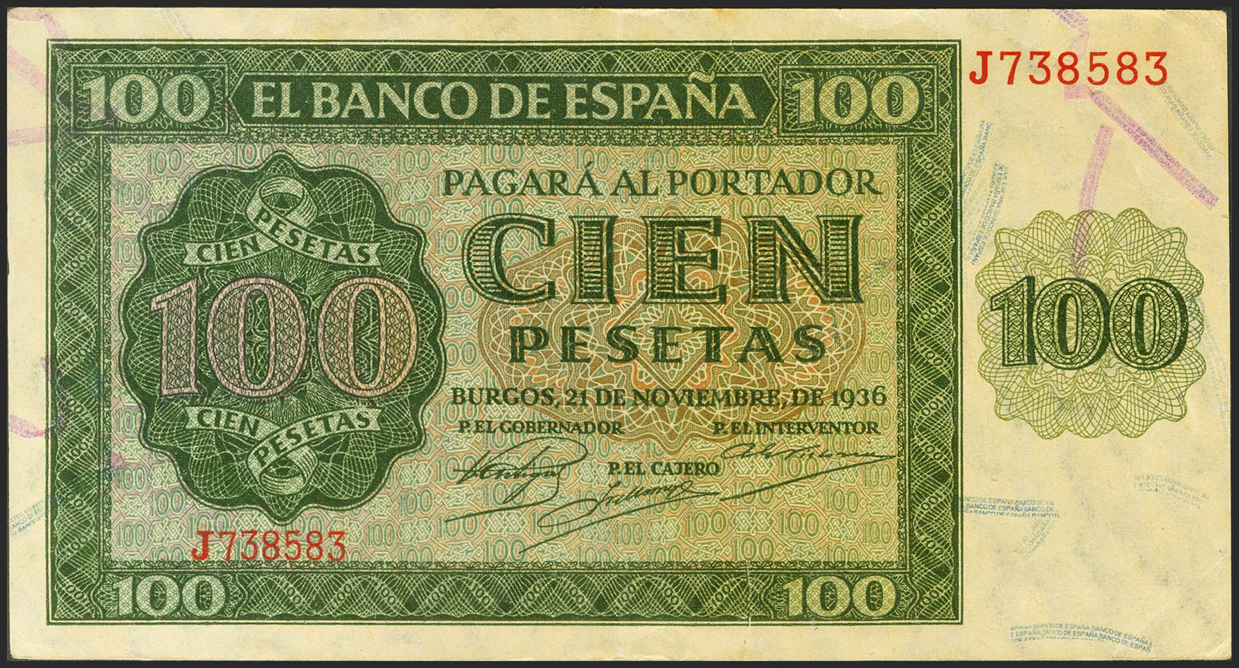 100 Pesetas. 21 de Noviembre de 1936. Serie J. (Edifil 2021: 421a). Conserva gran parte del apresto original. EBC.