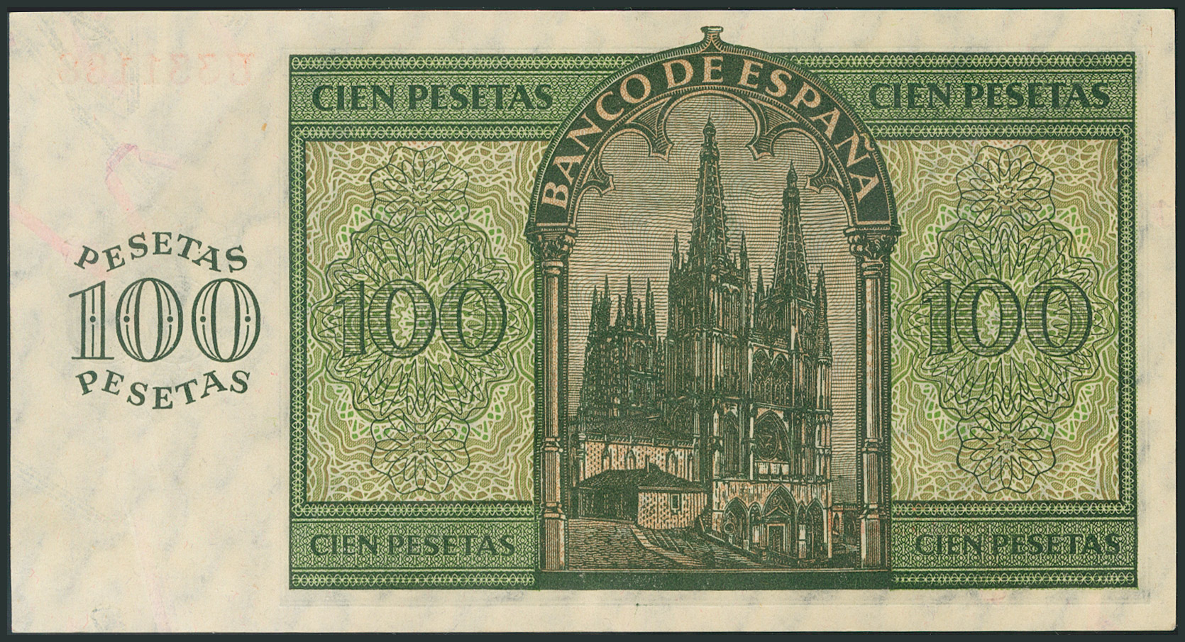 100 Pesetas. 21 de Noviembre de 1936. Serie U. Doblez vertical. (Edifil 2017: 421a). Pleno apresto original. EBC.
