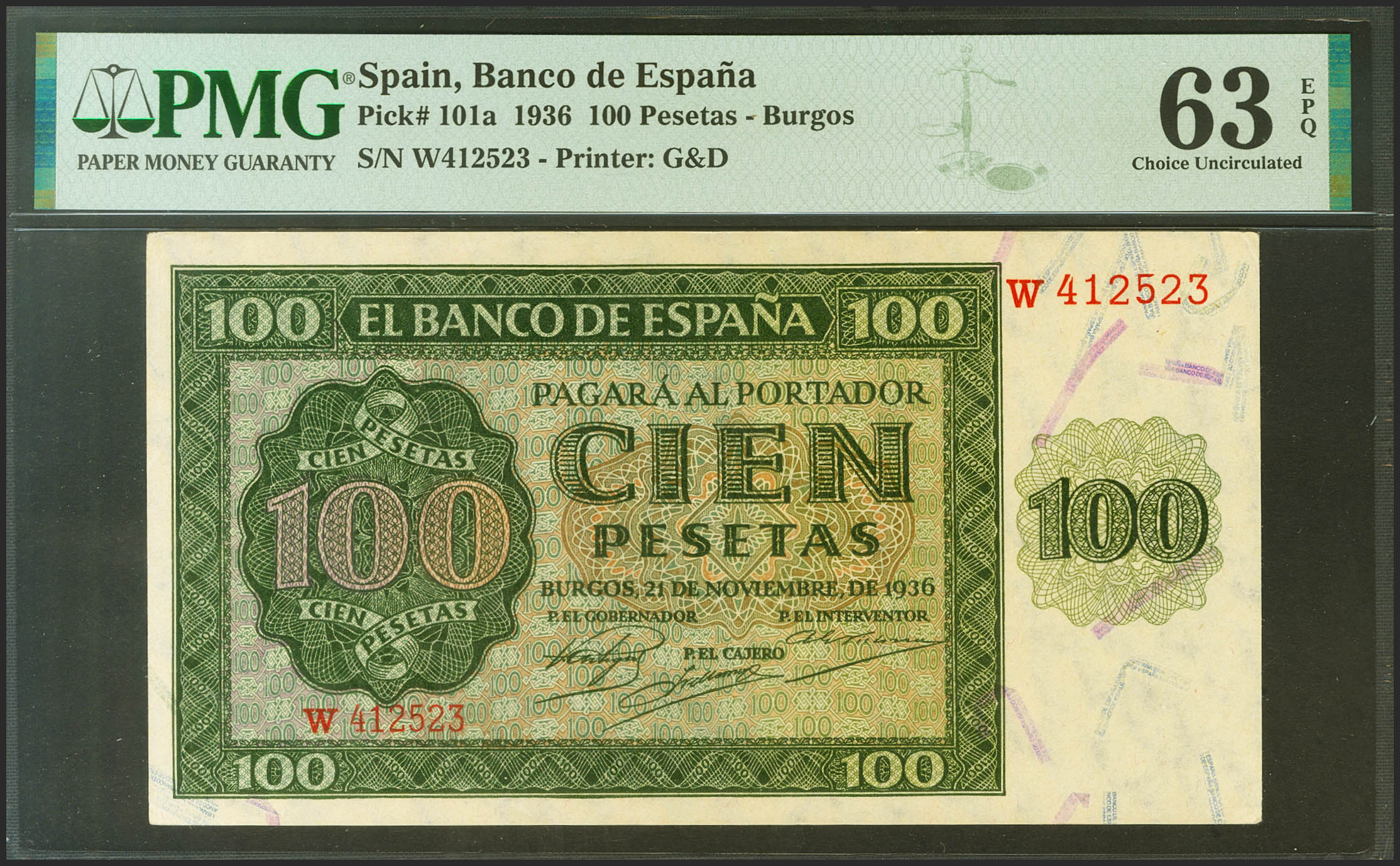 100 Pesetas. 21 de Noviembre de 1936. Serie W. (Edifil 2021: 421a, Pick: 101a). Apresto original. SC. Encapsulado PMG63EPQ.