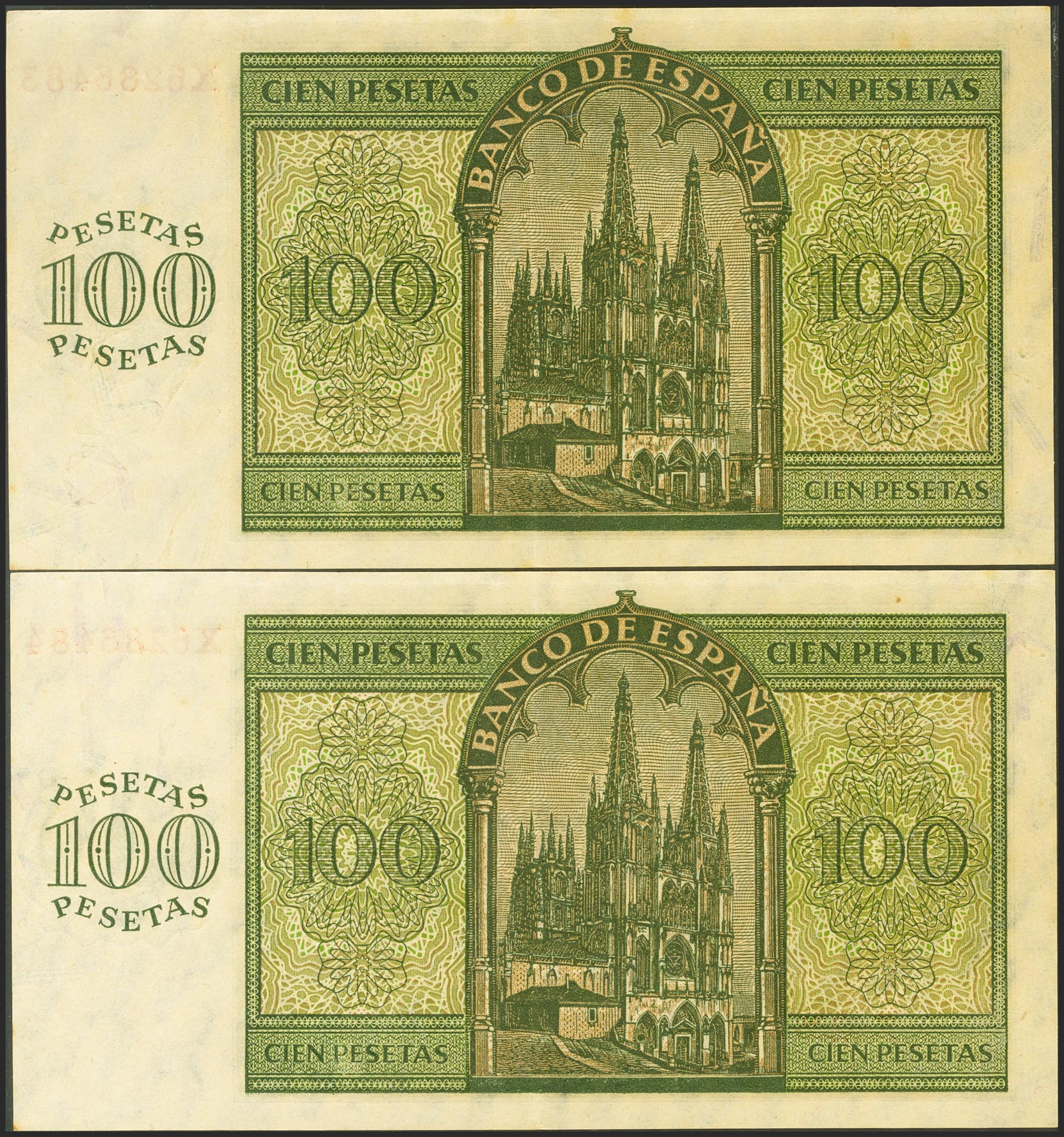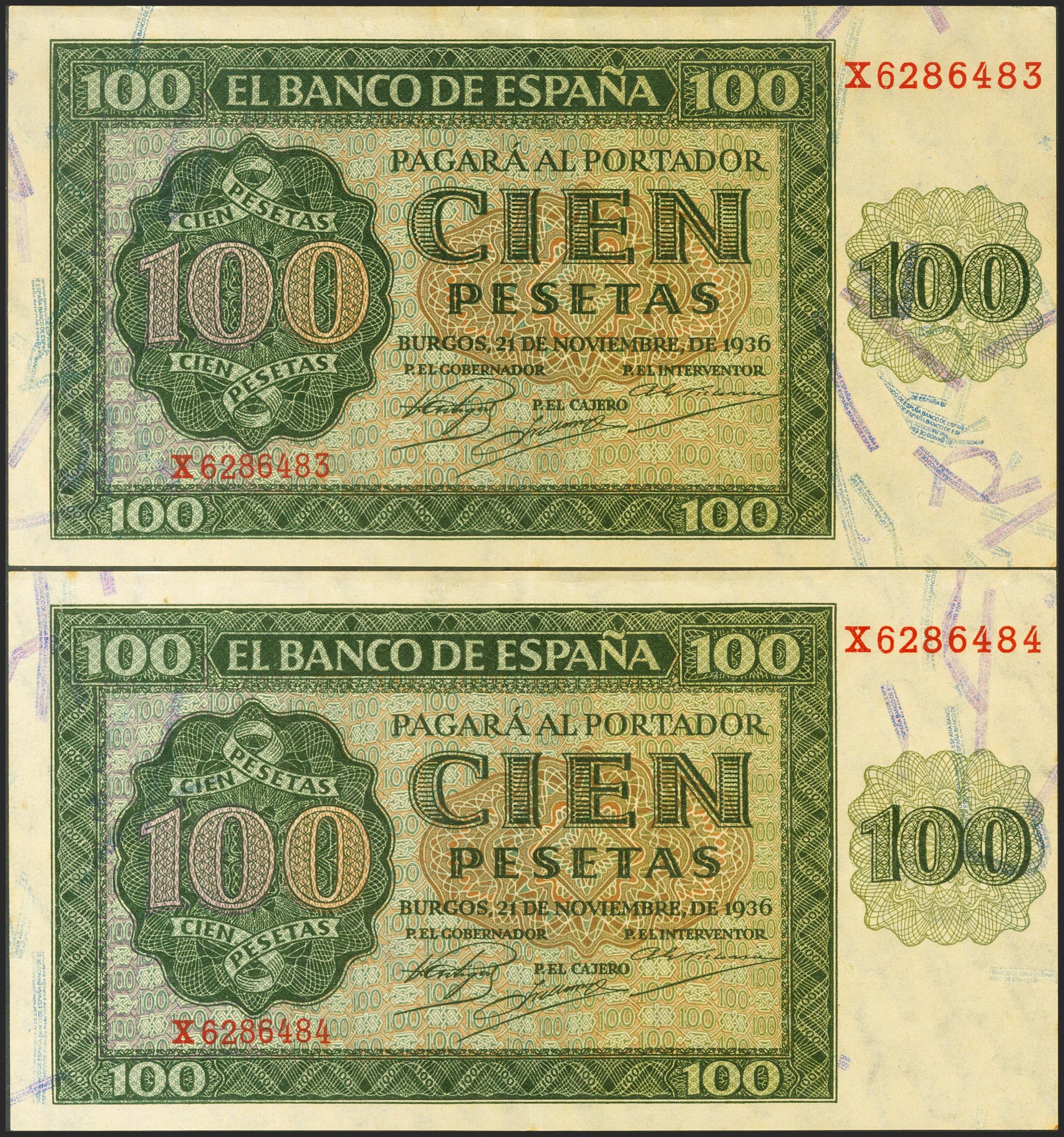 100 Pesetas. 21 de Noviembre de 1936. Pareja correlativa. Serie X, última serie emitida. (Edifil 2017: 421a). Conserva algo de apresto original. EBC+.