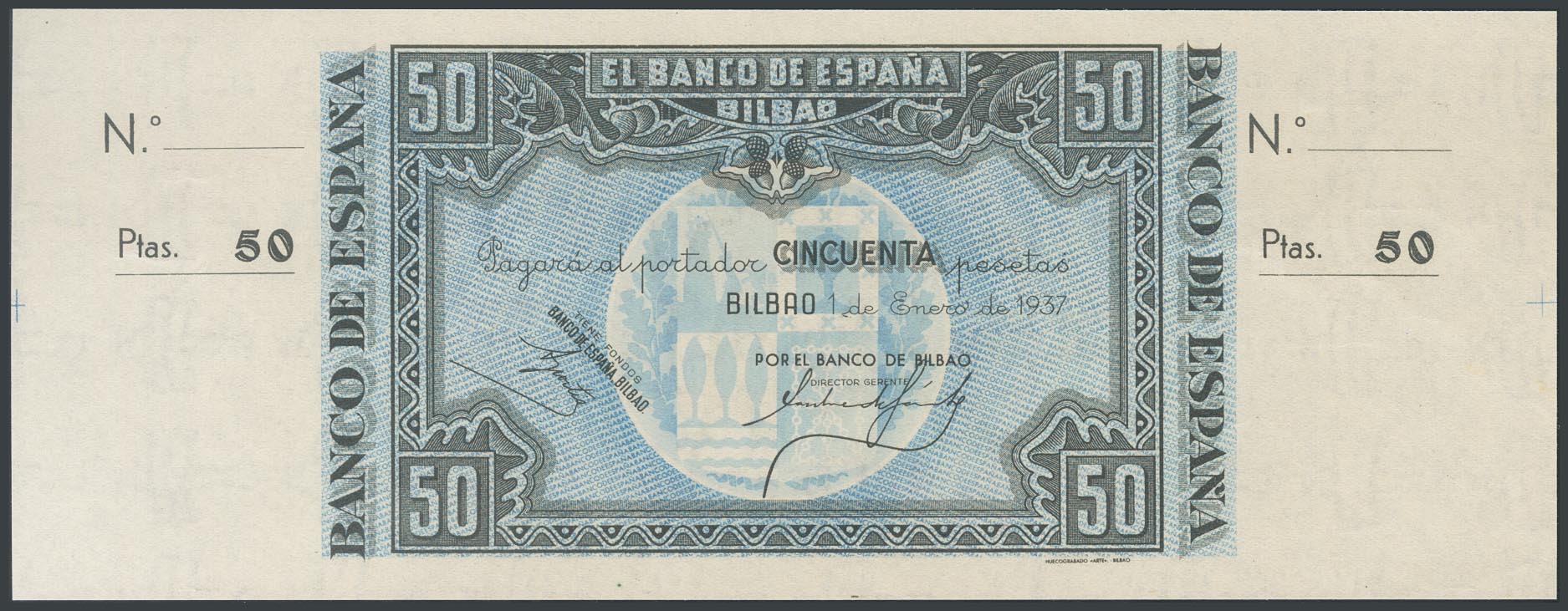 50 Pesetas. 1 de Enero de 1937. Sucursal de Bilbao, antefirma Banco de Bilbao. Sin serie y sin numeración, con ambas matrices. (Edifil 2017: 389a). SC-.