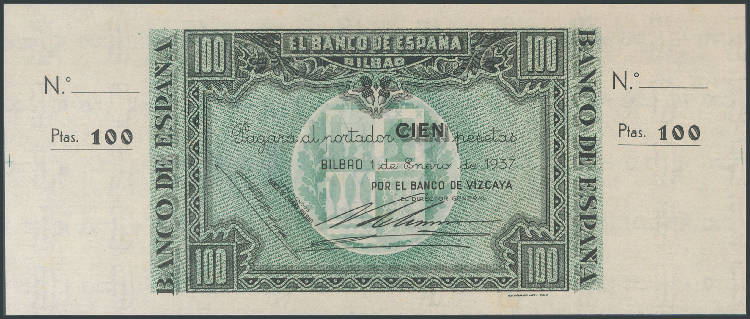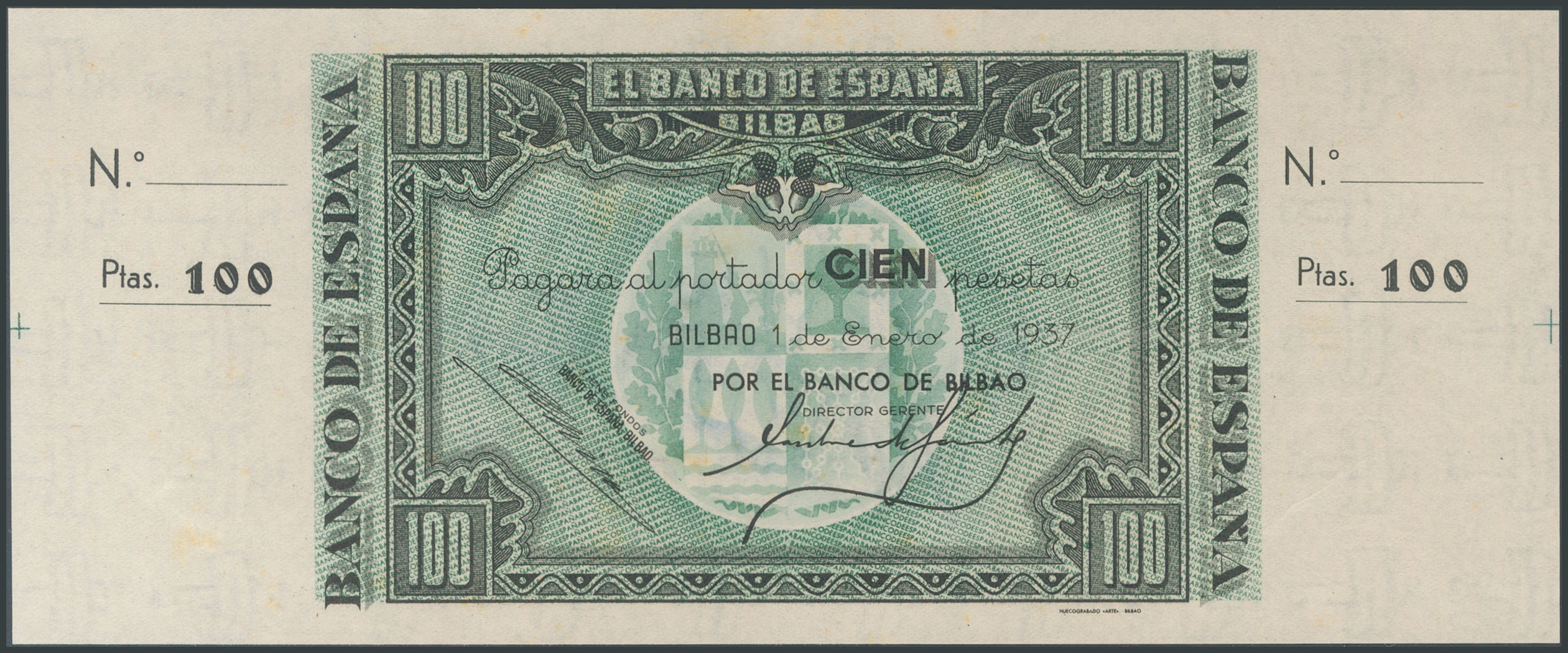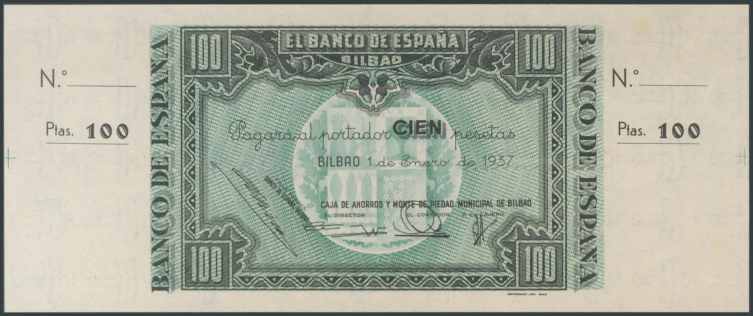 Conjunto de 3 billetes de 100 Pesetas emitidos por el Banco de España en la sucursal de Bilbao el 1 de Enero de 1937, incluyendo las 3 antefirmas conocidas, sin serie y sin numeración, con ambas matrices (Edifil 2017: 390a/c). Inusual conjunto. SC-.