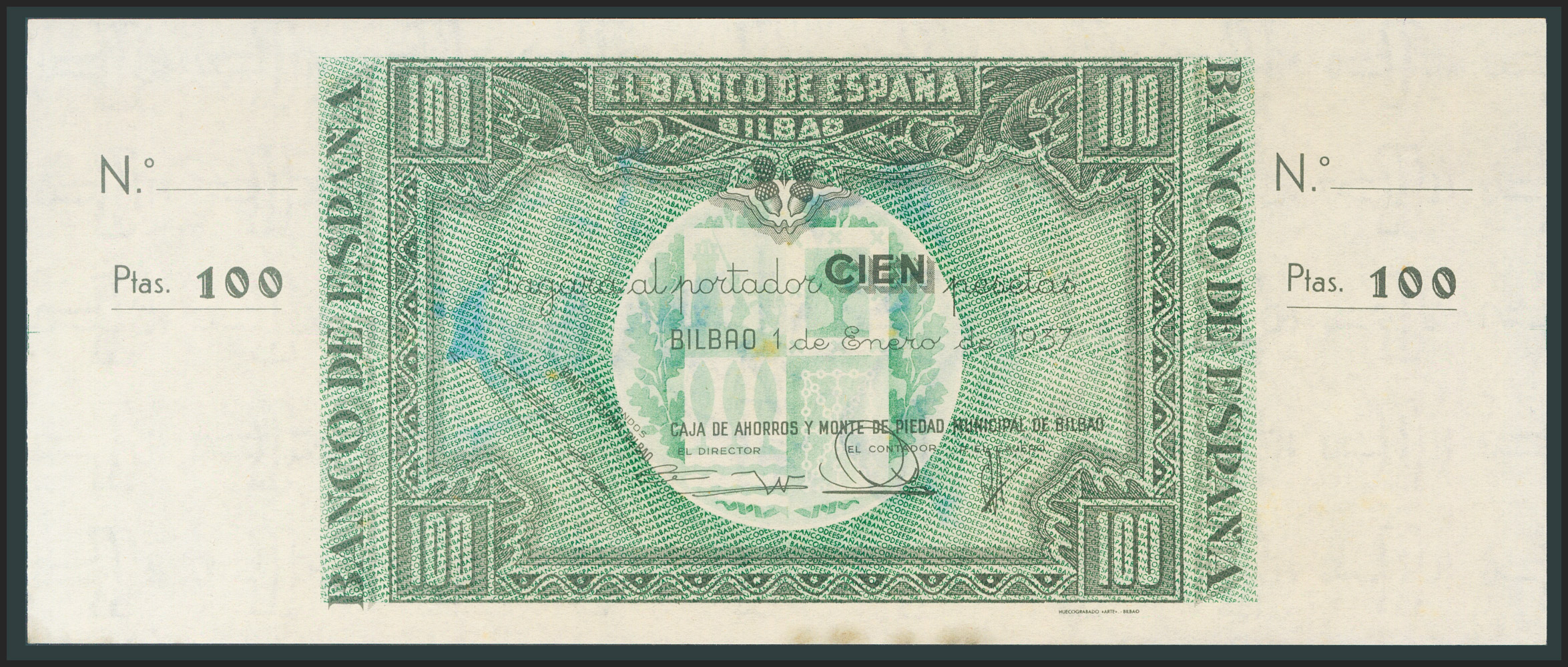 100 Pesetas. 1 de Enero de 1937. Sucursal de Bilbao, antefirma Caja de Ahorros y Monte de Piedad Municipal de Bilbao. Sin serie y sin numeración, con ambas matrices. (Edifil 2017: 390c). EBC+.
