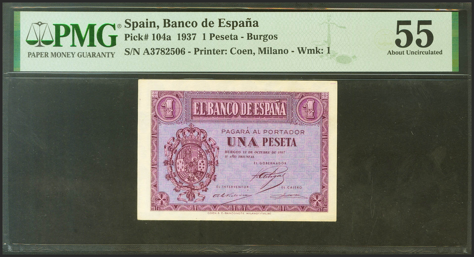 1 Peseta. 12 de Octubre de 1937. Serie A. (Edifil 2021: 425, Pick: 104a). EBC+. Encapsulado PMG55.