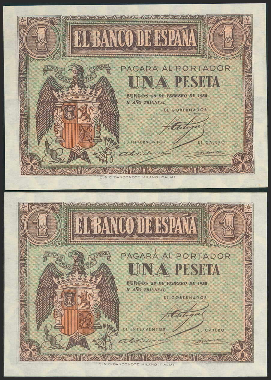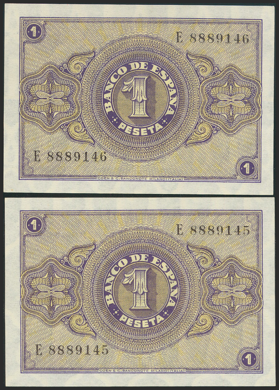 1 Peseta. 28 de Febrero de 1938. Pareja correlativa. Serie E. (Edifil 2021: 427a). Apresto original. SC-.