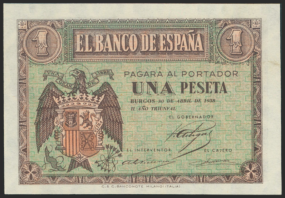 1 Peseta. 30 de Abril de 1938. Serie C. (Edifil 2021: 428a). Apresto original. SC-.