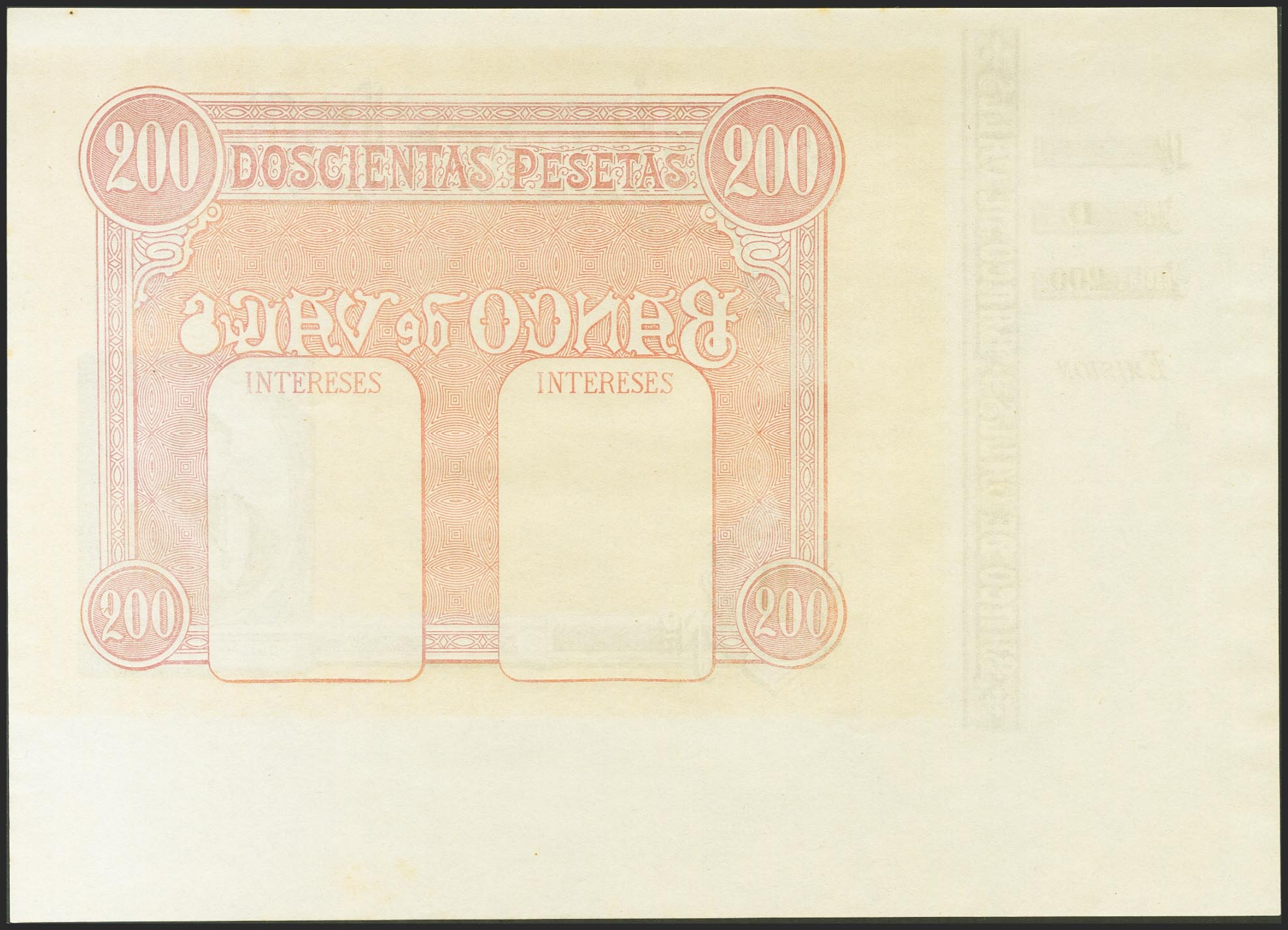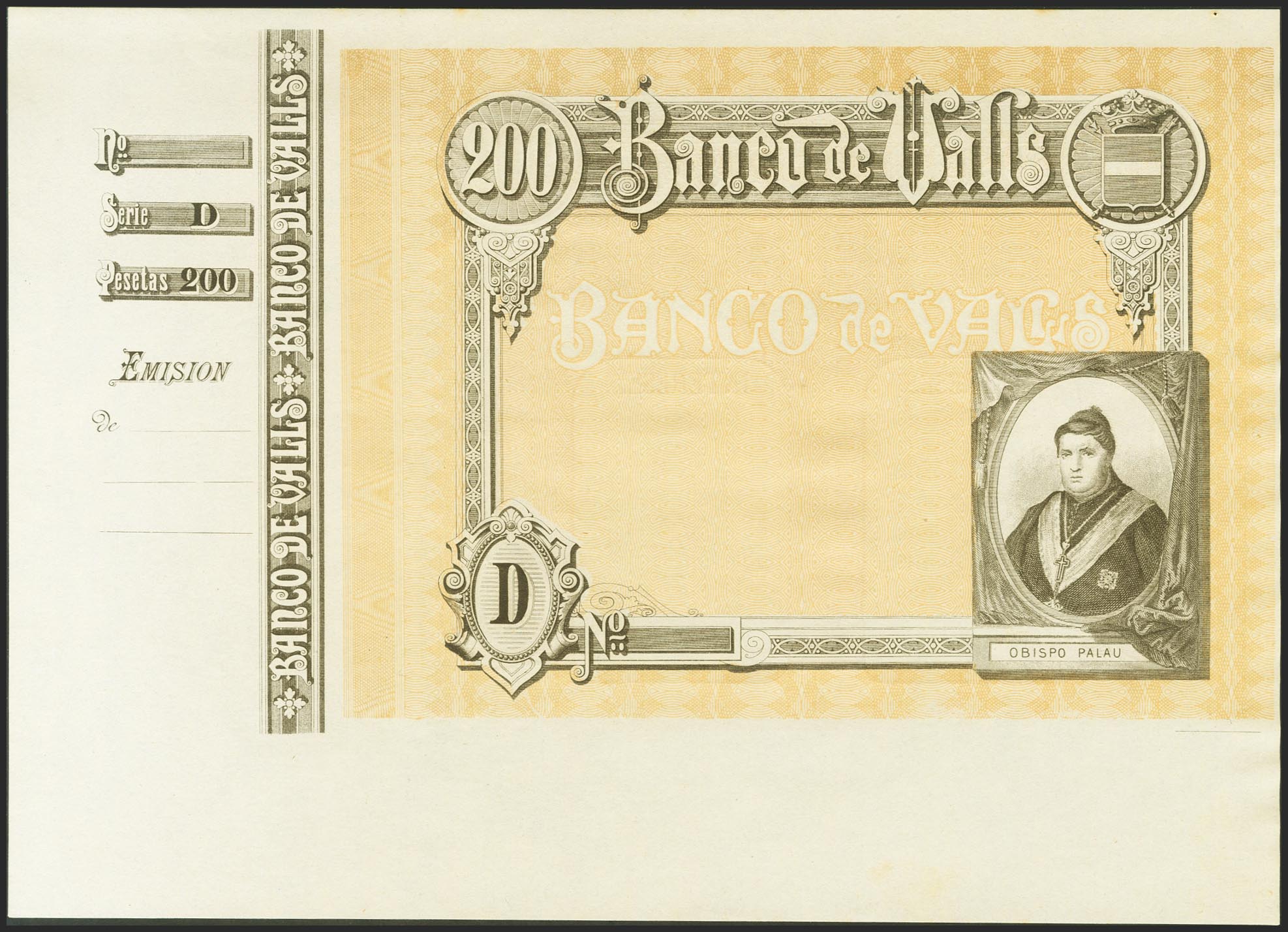 200 Pesetas. (1892ca). Banco de Valls. Prueba de Impresión, con matriz a la izquierda y sin texto. Serie D. (Ruiz y Alentorn: 933). SC.
