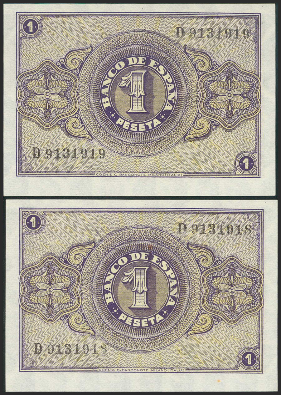1 Peseta. 30 de Abril de 1938. Pareja correlativa. Serie D. (Edifil 2021: 428a). Apresto original. SC-.
