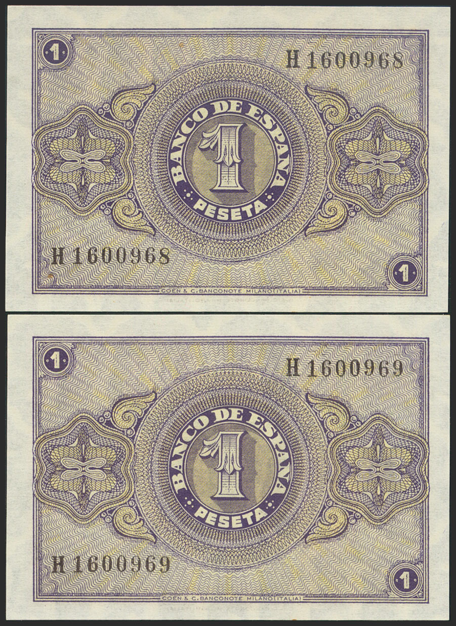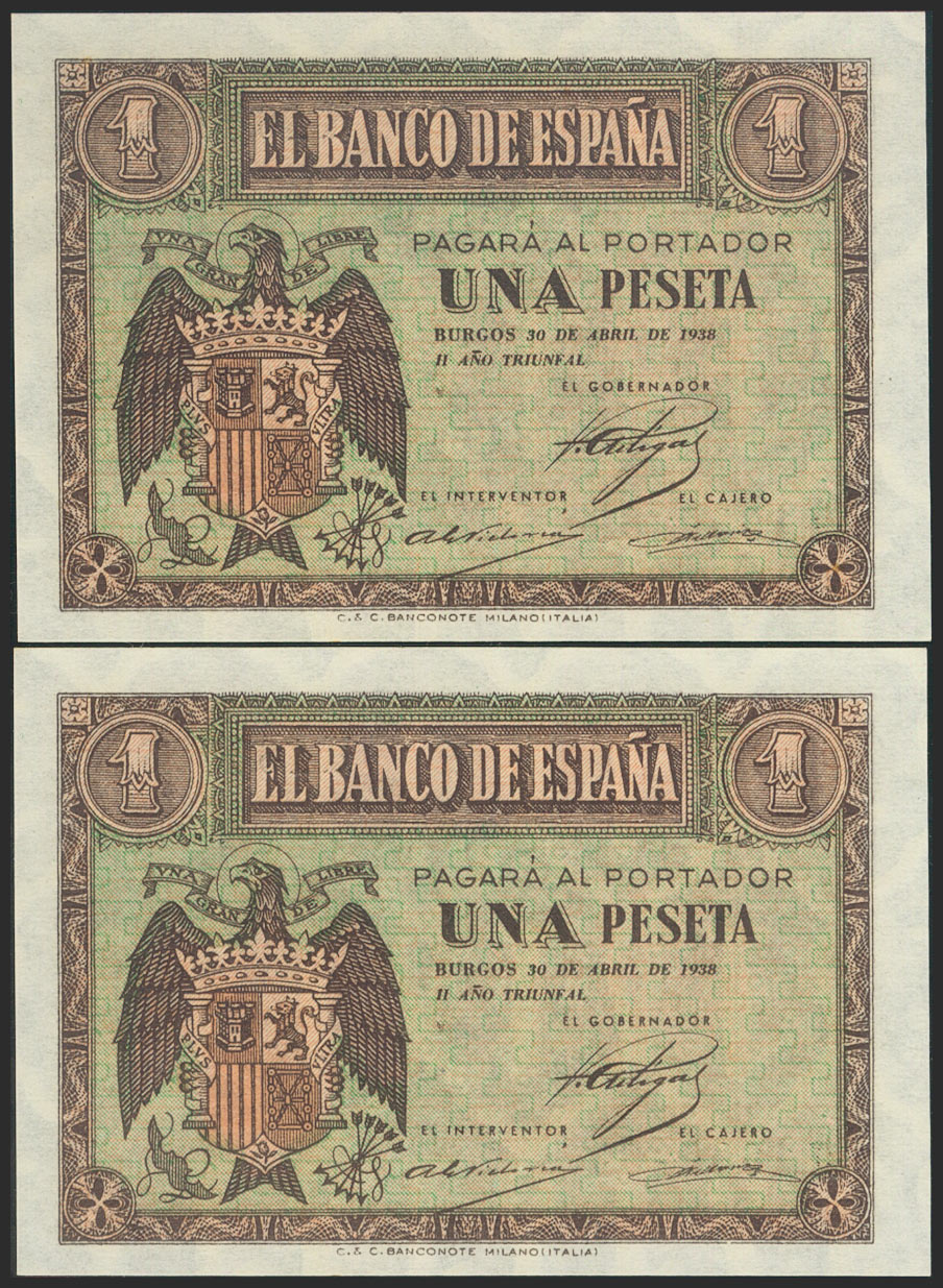 1 Peseta. 30 de Abril de 1938. Pareja correlativa. Serie H. (Edifil 2021: 428a). Apresto original. SC.