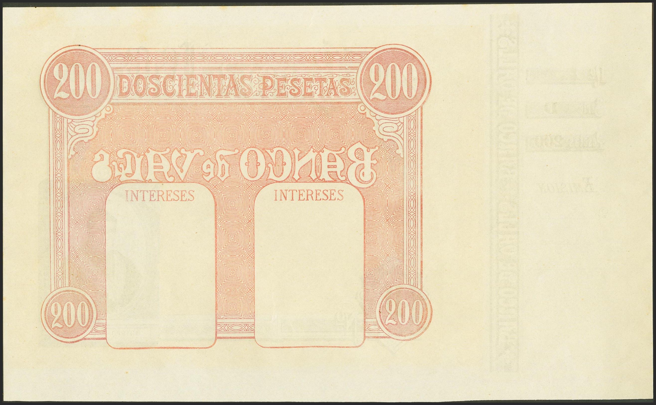 200 Pesetas. (1892ca). Banco de Valls. Prueba de Impresión, con matriz a la izquierda y sin texto. Serie D. (Ruiz y Alentorn: 933). SC-.