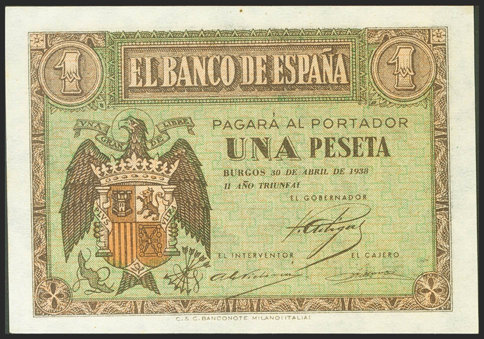 1 Peseta. 30 de Abril de 1938. Serie L. (Edifil 2021: 428a). Apresto original. SC-.