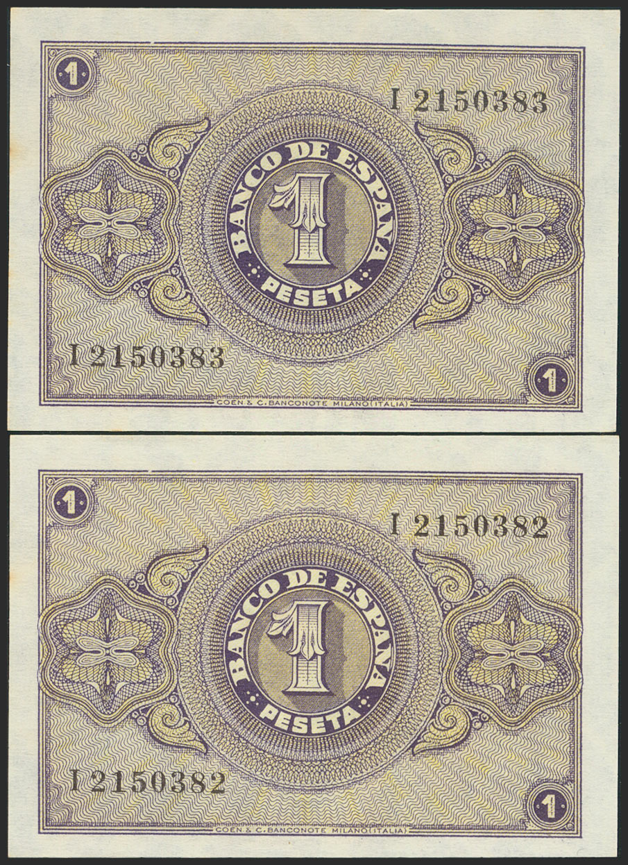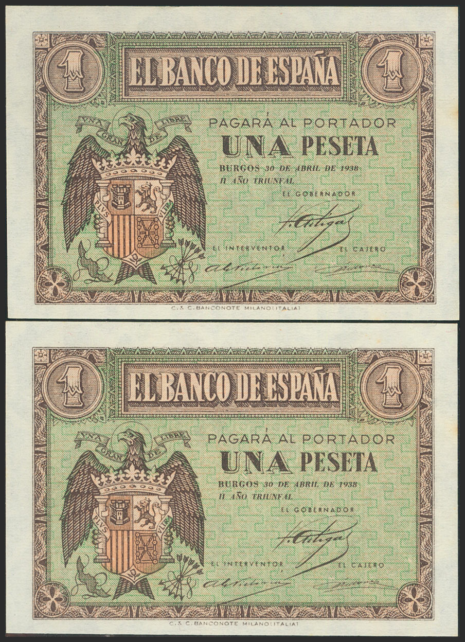 1 Peseta. 30 de Abril de 1938. Pareja correlativa. Serie I. (Edifil 2021: 428a). Apresto original. SC-.