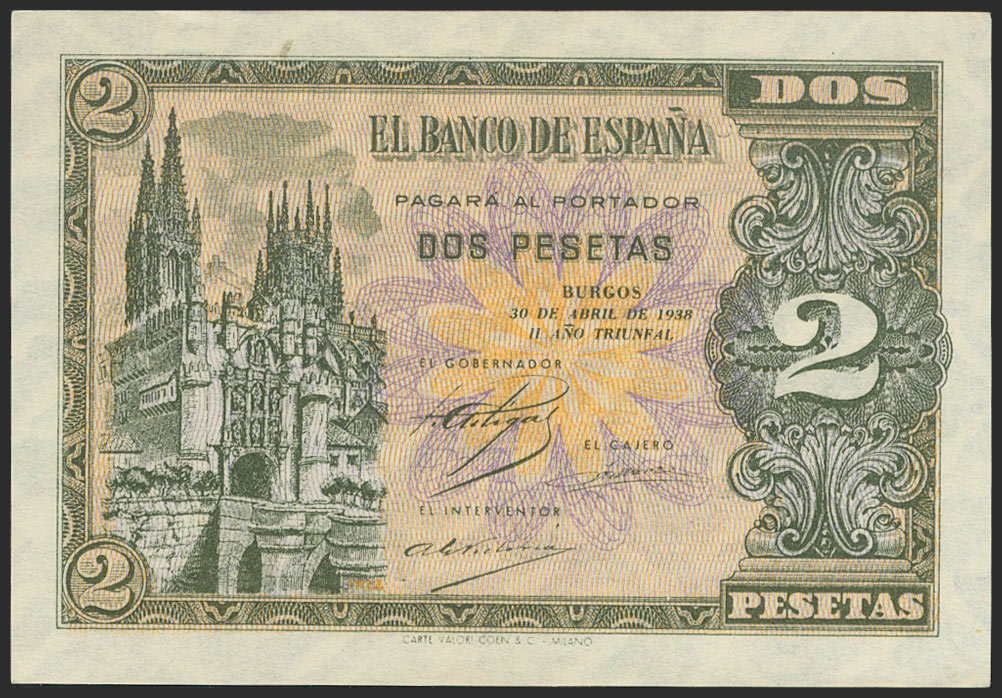 2 Pesetas. 30 de Abril de 1938. Serie I. (Edifil 2021: 429a). Apresto original. SC.