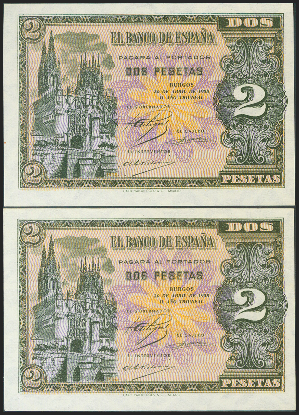 2 Pesetas. 30 de Abril de 1938. Pareja correlativa. Serie M. (Edifil 2021: 429a). Apresto original. SC.