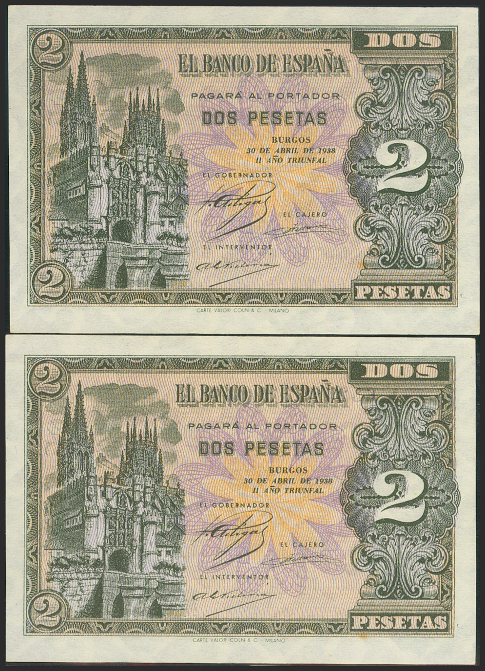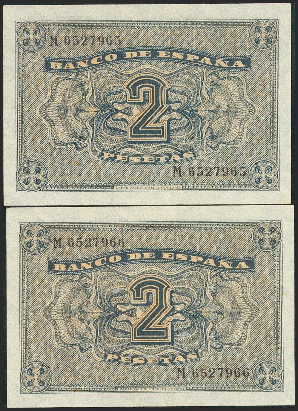 2 Pesetas. 30 de Abril de 1938. Pareja correlativa. Serie M. (Edifil 2021: 429a). Apresto original. SC/SC-.