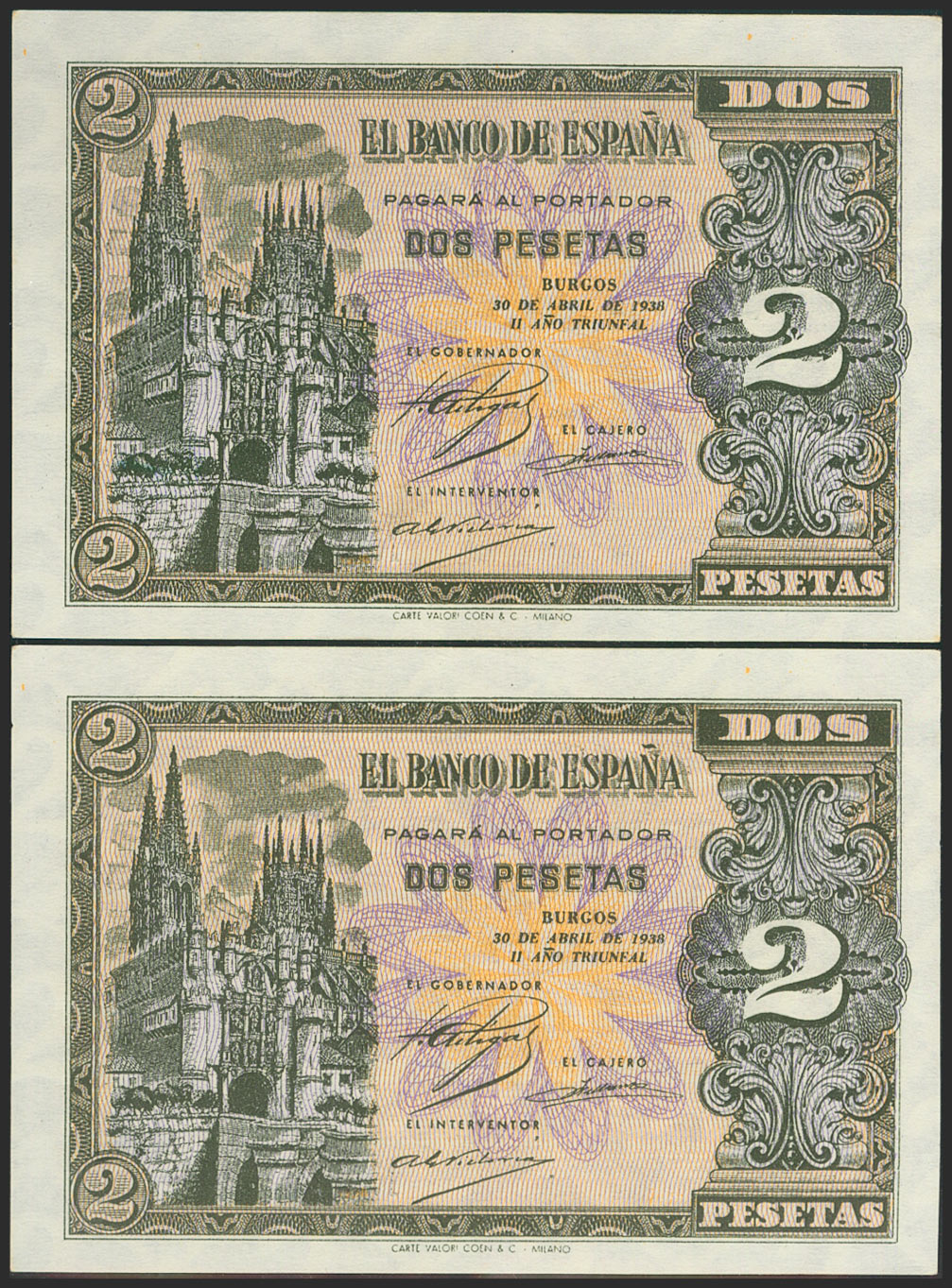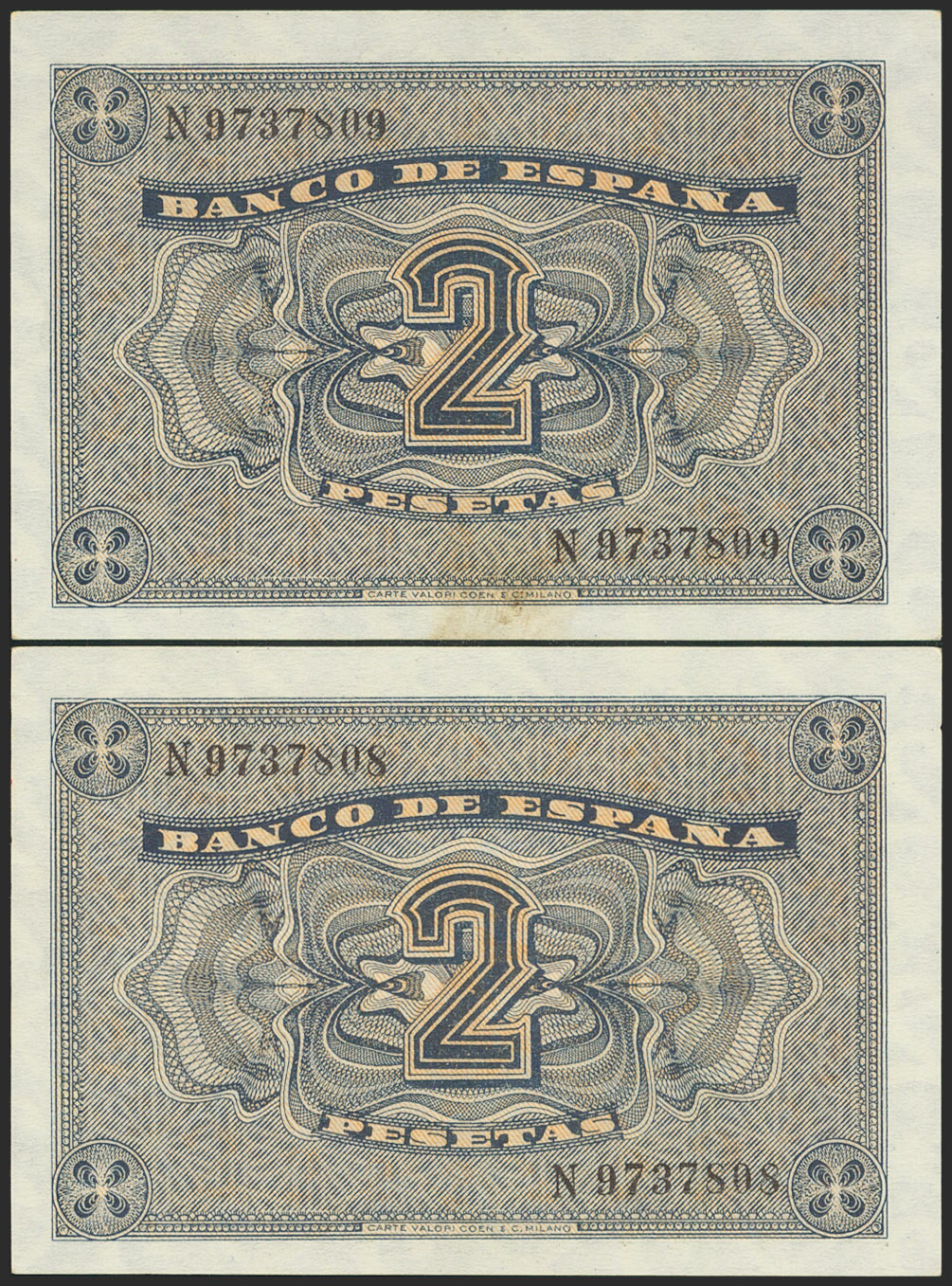 2 Pesetas. 30 de Abril de 1938. Pareja correlativa. Serie N, última serie emitida. (Edifil 2021: 429a). Apresto original. SC/SC-.