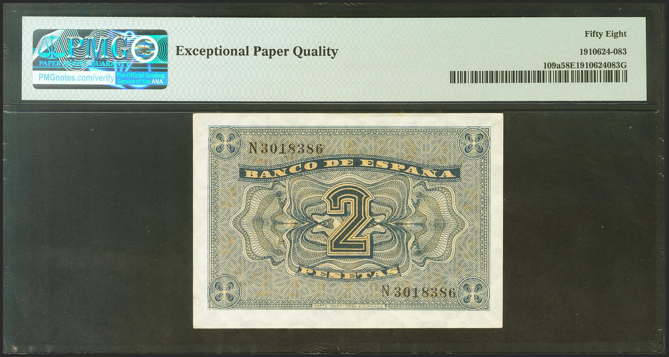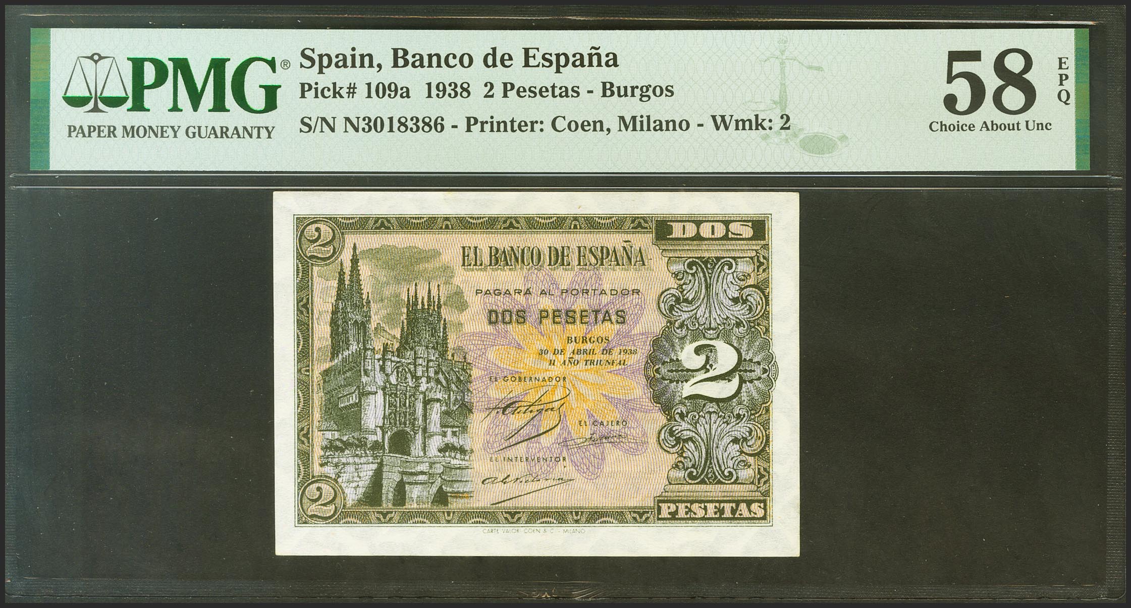 2 Pesetas. 30 de Abril de 1938. Serie N, última serie emitida. (Edifil 2021: 429a, Pick: 109a). Apresto original. EBC.+++ Encapsulados PMG58EPQ.