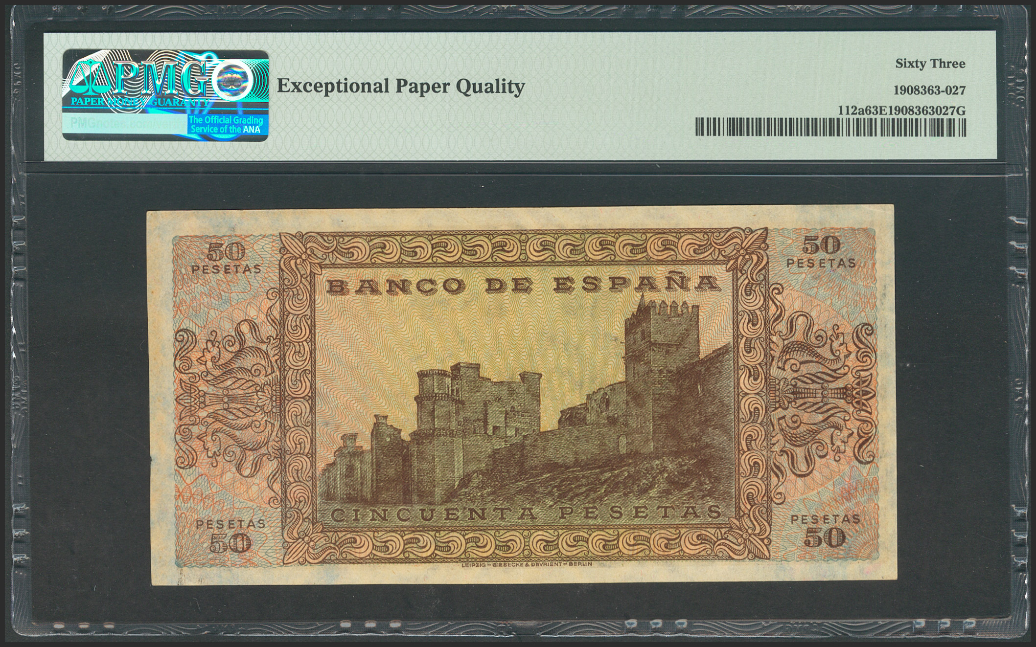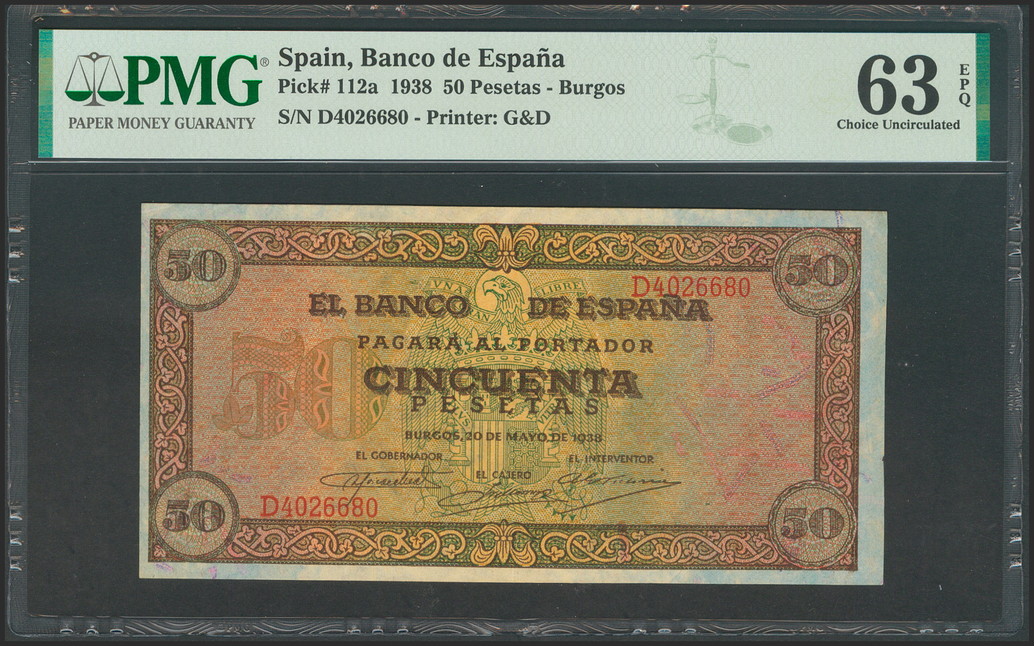 50 Pesetas. 20 de Mayo de 1938. Serie D. (Edifil 2017: 431a). Inusual y apresto original. SC. Encapsulado PMG63EPQ.
