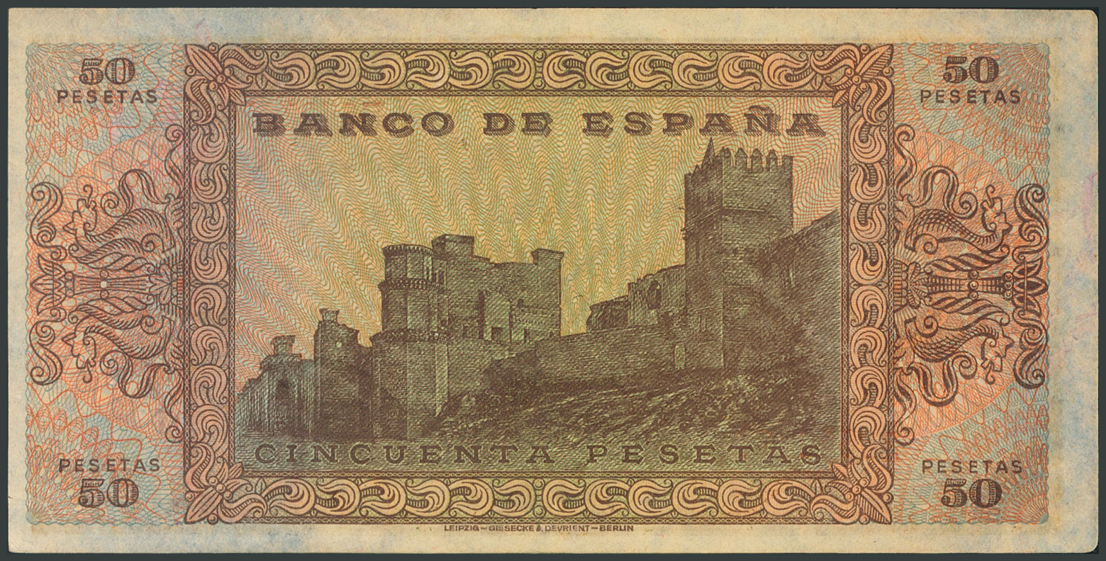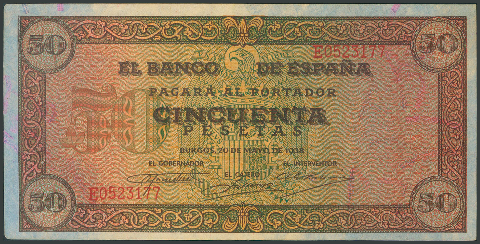 50 Pesetas. 20 de Mayo de 1938. Serie E, última serie emitida. (Edifil 2017: 431a). Apresto original, esquinas izquierdas "redondeadas". SC-.