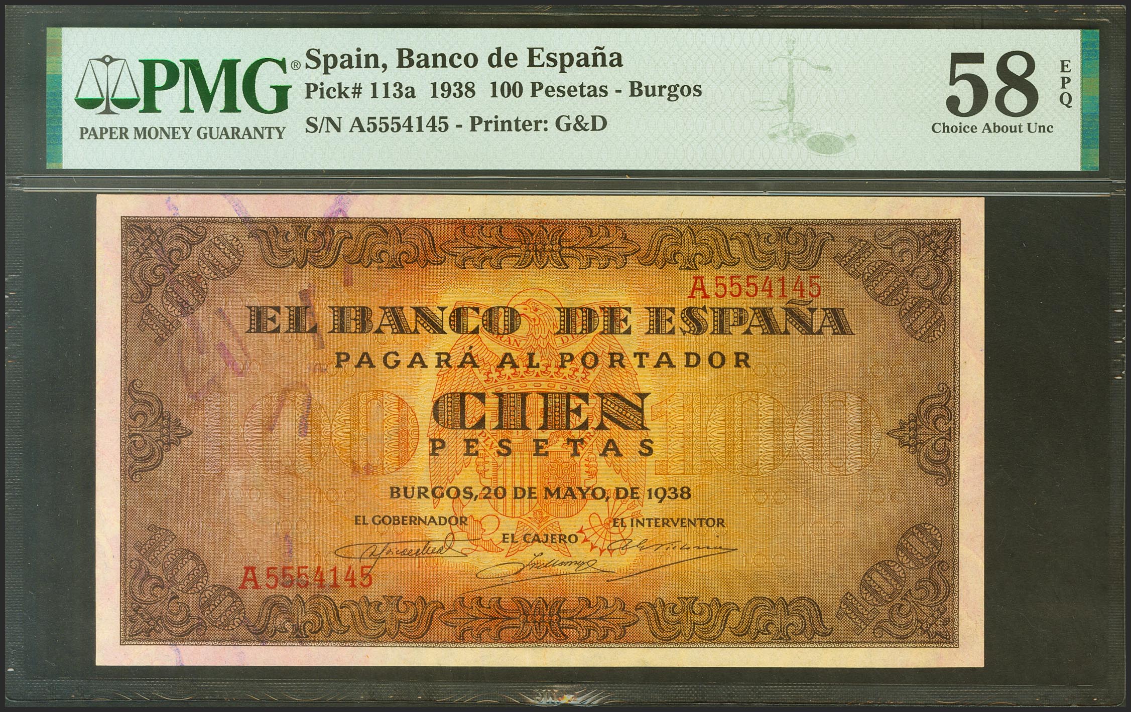 100 Pesetas. 20 de Mayo de 1938. Serie A. (Edifil 2021: 432, Pick: 113a). Apresto original. EBC+++. Encapsulado PMG58EPQ.