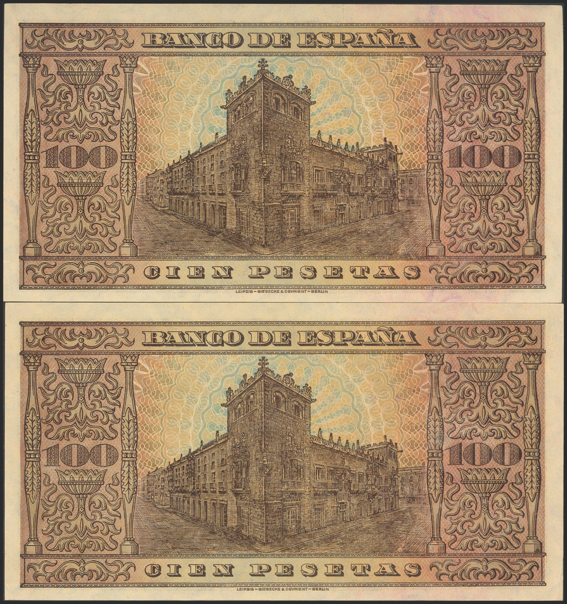 100 Pesetas. 20 de Mayo de 1938. Banco de España, Burgos, pareja casi correlativa. Serie A. Apresto original. (Edifil 2017: 432). EBC+.